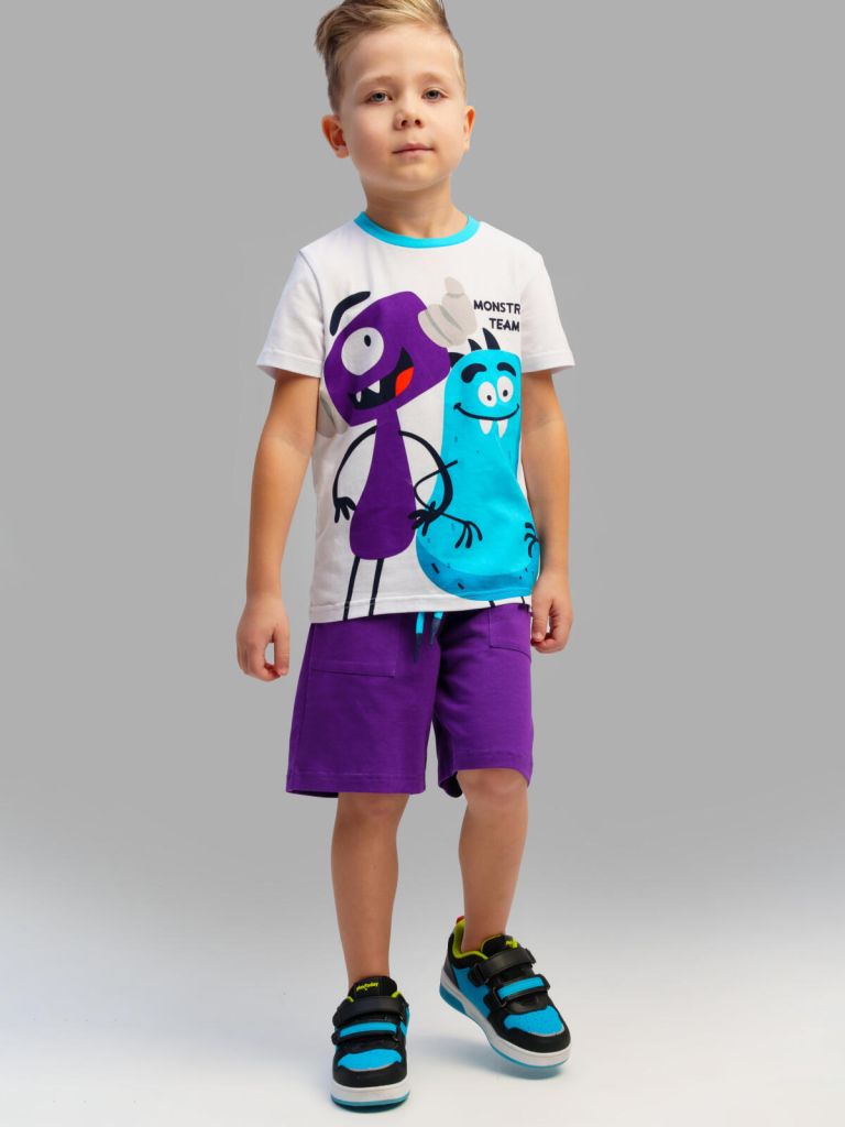 Костюм детский для мальчика. Комплект: футболка, шорты с высоким содержанием хлопка 95%. Благодаря наличию эластана в составе ткани изделие проще в уходе и держит форму. Шорты на резинке со шнурком. Боковые карманы.