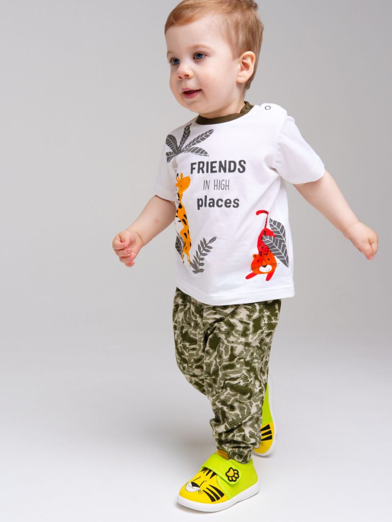 Комплект: футболка и брюки. Выполнен из эластичного и приятного на ощупь трикотажа. Футболка с застежкой на кнопки. Брюки с карманами в боковых швах. Эластичный пояс со шнурком. Эластичные манжеты по низу брючин. Высокое содержание хлопка 95%. Благодаря наличию эластана в составе ткани изделие держит форму и меньше мнется.