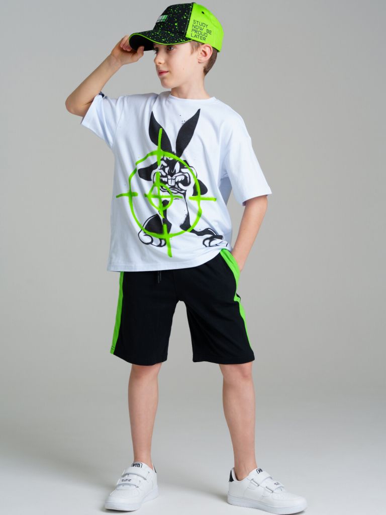 Комплект: футболка и шорты из качественного эластичного и приятного на ощупь трикотажа. Футболка oversize. Брюки comfort fit. На шортах эластичный пояс со шнурком. Карманы в боковых швах. Высокое содержание хлопка 95%. Благодаря наличию эластана в составе ткани изделие держит форму и меньше мнется.