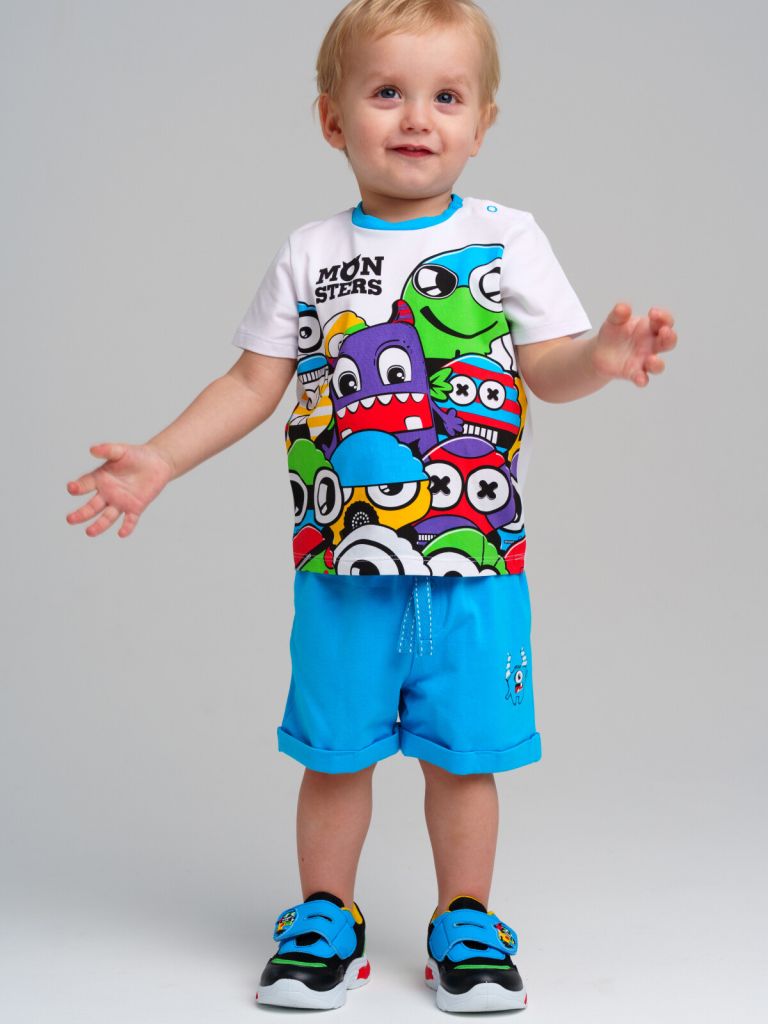 Комплект: футболка и шорты из качественного, эластичного и приятного на ощупь трикотажа. Выполнен из трикотажа разных цветов. Застежка на кнопки на левом плече. Эластичный пояс со шнурком. Посадка regular fit – классический крой. Высокое содержание хлопка 95%. Благодаря наличию эластана в составе ткани изделие держит форму и меньше мнется.