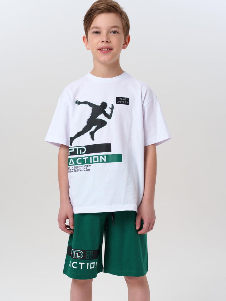 Этот физкультурный подростковый костюм для мальчиков выполнен из приятного к телу трикотажа с добавлением эластана, что делает его одновременно эластичным и устойчивым к деформации. Базовая белая футболка оверсайз придаёт образу модный и расслабленный вид, а универсальные спортивные зеленые шорты со шнурком удобно сидят по фигуре и не сползают даже во время подвижных игр.