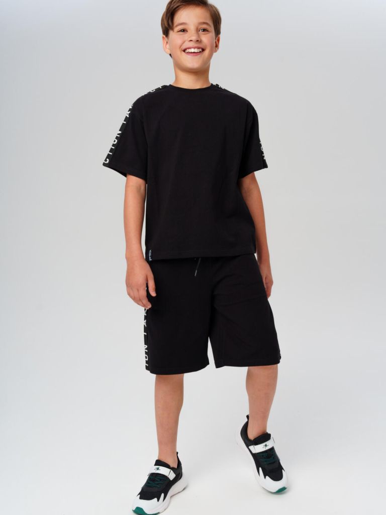 Этот физкультурный подростковый костюм для мальчиков выполнен из приятного к телу трикотажа с добавлением эластана, что делает его одновременно эластичным и устойчивым к деформации. Базовая черная футболка оверсайз придаёт образу модный и расслабленный вид, а универсальные спортивные черные шорты со шнурком удобно сидят по фигуре и не сползают даже во время подвижных игр.