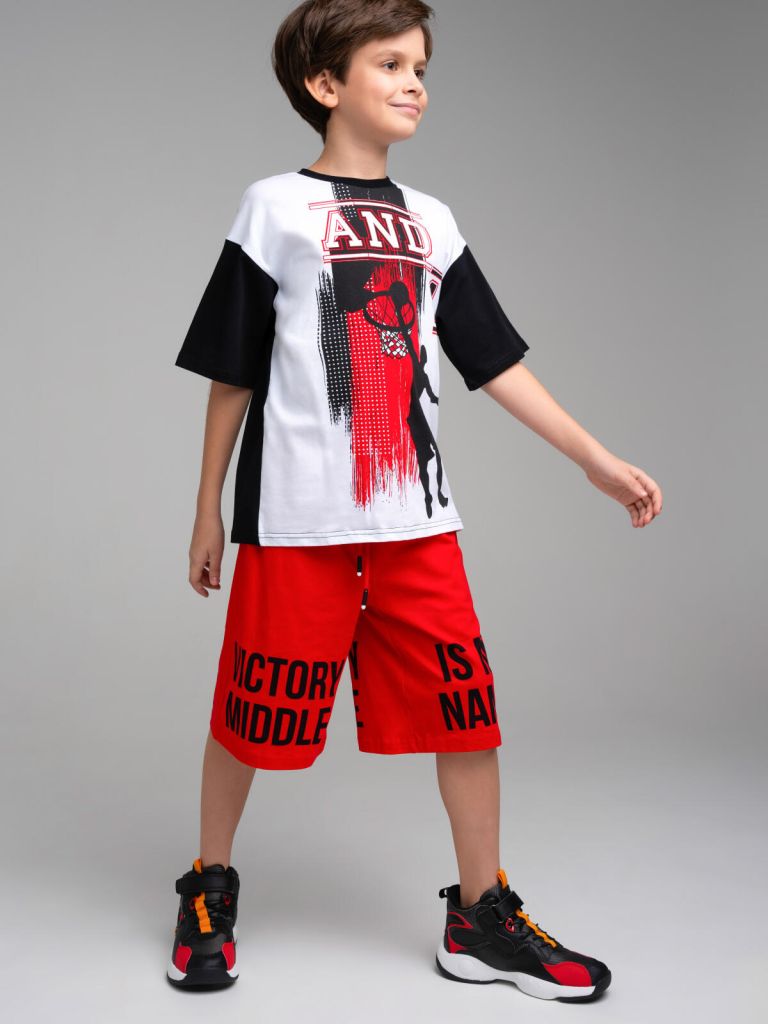 Костюм для мальчика подростка. Комплект оверсайз: футболка, шорты с высоким содержанием хлопка 95%. Благодаря наличию эластана в составе ткани изделие проще в уходе и держит форму. Шорты на резинке со шнурком. Боковые карманы. Модель выполнена из качественного и приятного на ощупь трикотажа.