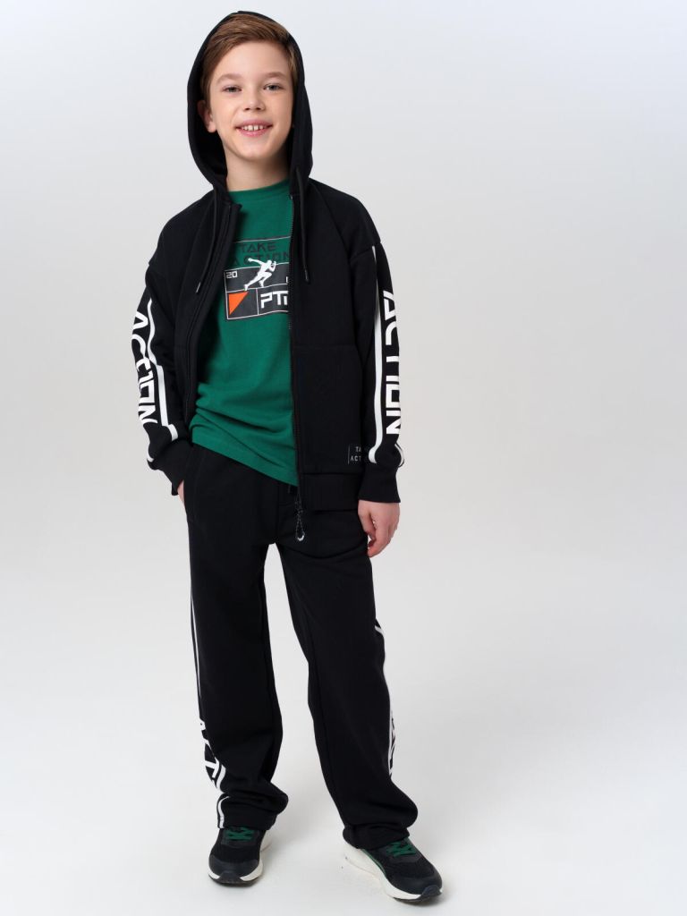 Этот черный подростковый физкультурный костюм для мальчиков выполнен из приятного футера без начёса — ткань хорошо дышит, сохраняет комфорт и подходит для носки в помещении и на улице. Комфортная спортивная толстовка с молнией позволяет ребёнку легко снять или надеть верх, адаптируя комплект к температуре. Универсальные стильные брюки джоггеры со шнурком на талии и мягкими манжетами не сползают и не мешают во время движения.