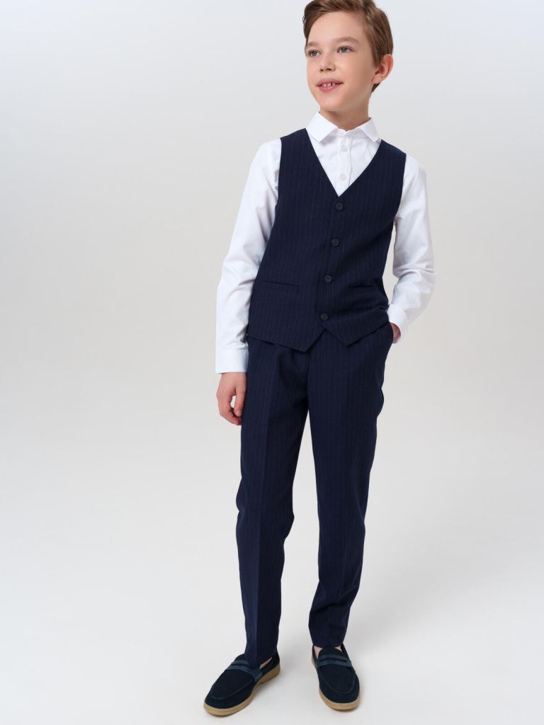 Элегантный жилет для мальчиков на подкладке аккуратно садится по фигуре, дополнен карманами для мелочей. Школьные классические синие брюки для подростков прямого кроя с поясом на мягкой резинке и утяжкой-шнурком обеспечивают комфортную посадку и адаптацию под фигуру ребёнка. Карманы в боковых швах добавляют практичности.