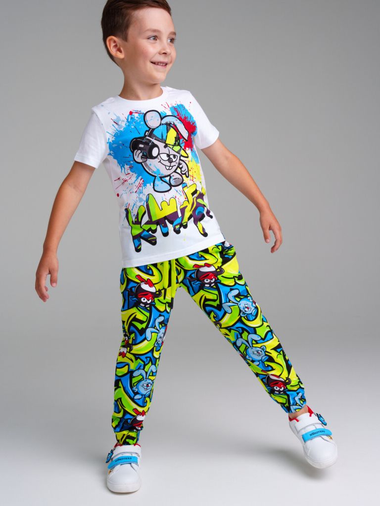 Комплект "Смешарики": футболка и брюки. Выполнен из эластичного и приятного на ощупь трикотажа. Брюки с карманами в боковых швах. Эластичный пояс со шнурком. Эластичные манжеты по низу брючин. Высокое содержание хлопка 95%. Благодаря наличию эластана в составе ткани изделие держит форму и меньше мнется.