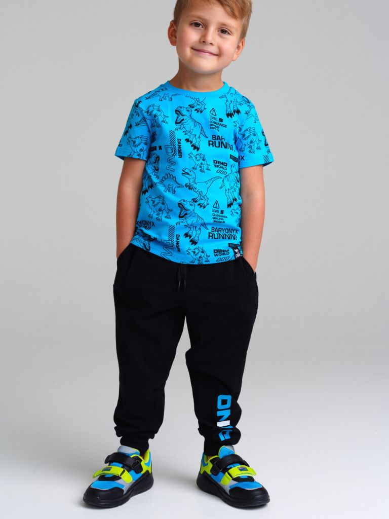 Комплект: футболка и брюки. Выполнен из эластичного и приятного на ощупь трикотажа. Брюки с карманами в боковых швах. Эластичный пояс со шнурком. Эластичные манжеты по низу брючин. Высокое содержание хлопка 95%. Благодаря наличию эластана в составе ткани изделие держит форму и меньше мнется.