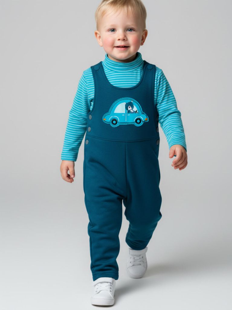 Модный бирюзовый комплект для мальчика с боди-водолазкой и полукомбинезоном от PlayToday — это практичная и стильная одежда для детского сада, прогулок и активного отдыха.