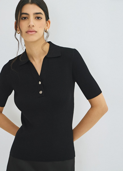 Джемпер в рубчик с воротником-поло, Черный