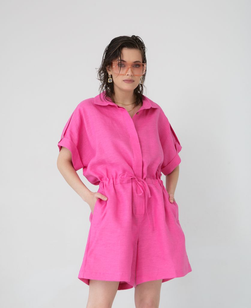 Яркий комбинезон цвета фуксия из 100% льна станет стильным акцентом в вашем летнем гардеробе. Изготовлен из натурального льна, он дарит приятную прохладу в теплые дни и обеспечивает отличную воздухопроницаемость. Свободный фасон с короткими рукавами и шортами позволяет чувствовать себя комфортно и легко, а эластичный пояс с завязками подчеркивает талию, создавая женственный силуэт. Наличие карманов добавляет практичности и удобства в повседневной носке. Этот комбинезон идеально подойдет как для прогулок по городу, так и для отдыха на природе или на пляже. Таблица размеров