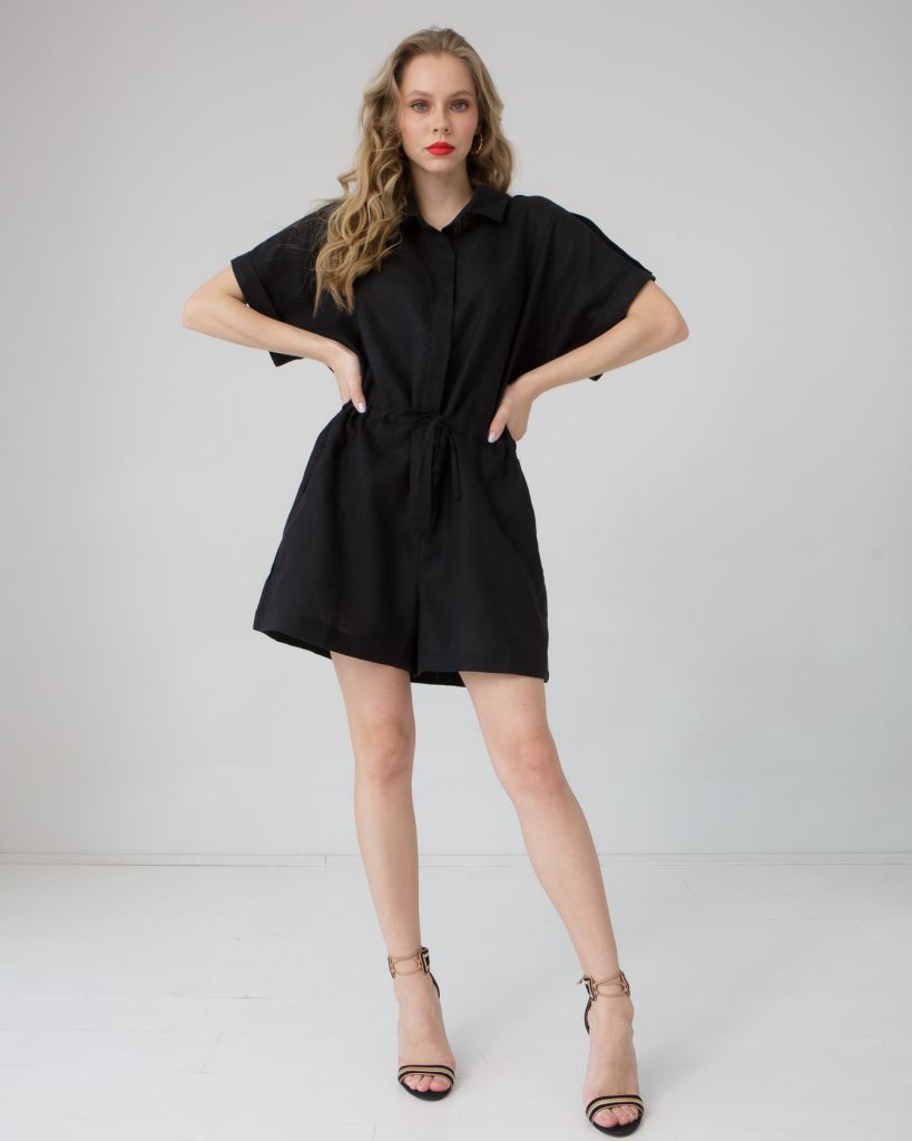 Черный льняной комбинезон — идеальное сочетание стиля и комфорта. Выполнен из 100% натурального льна, он обладает высокой воздухопроницаемостью и дарит ощущение свежести в жаркие летние дни. Удобный крой с короткими рукавами и свободными штанинами обеспечивает свободу движений, а завязывающийся пояс на талии подчеркивает фигуру и добавляет элегантности. Застежка на пуговицы спереди придает изделию современный и стильный вид. Этот комбинезон станет отличным выбором как для повседневной носки, так и для отдыха на природе или прогулок по городу. Таблица размеров