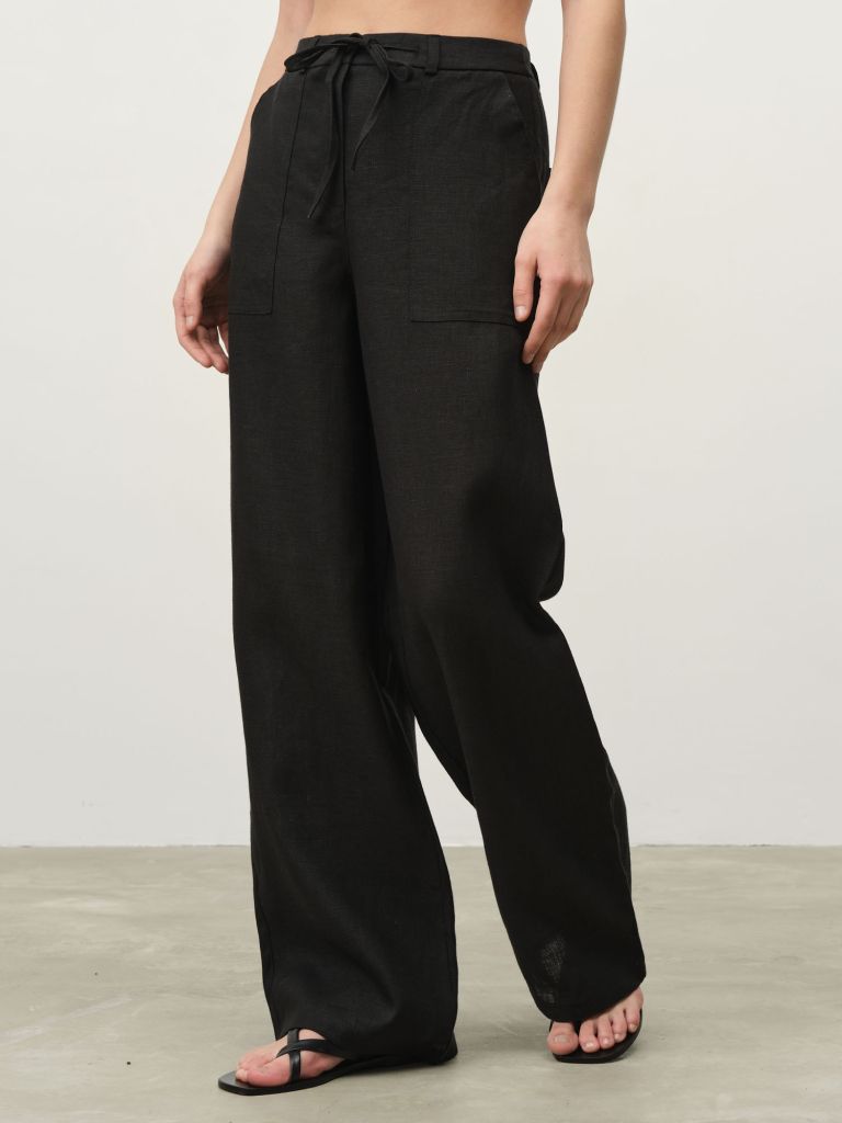 Женские черные брюки из льна – идеальное сочетание комфорта и элегантности. Натуральный материал позволяет коже дышать, а свободный крой дарит легкость движений. Пояс на кулиске обеспечивает удобную посадку и подчеркивает талию, создавая стильный силуэт.Эти брюки станут универсальной базой для любого гардероба. Их можно носить с топами и кроссовками для повседневного образа или сочетать с блузкой и туфлями для более строгого и элегантного стиля.Размерная сетка