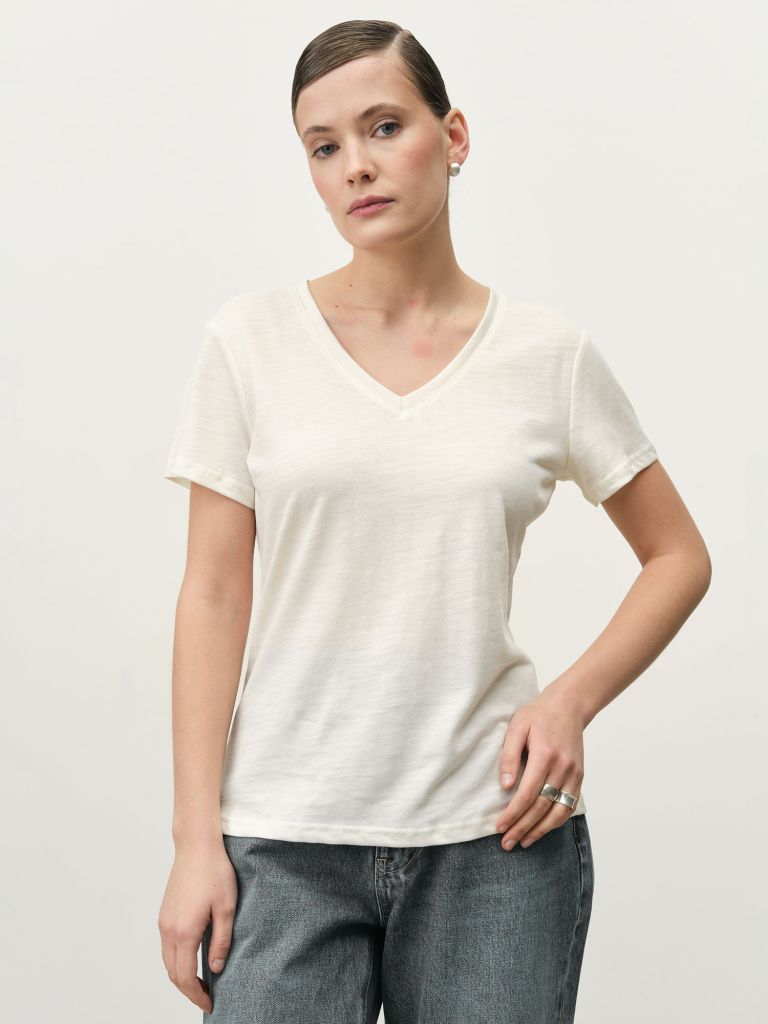 Легкая футболка из крапивы в молочном оттенке — комфорт и экологичность в одном. Дышащая ткань приятно прилегает к телу и подходит для любого сезона. V-образный вырез добавляет образу элегантности. Отличный выбор для базового гардероба.