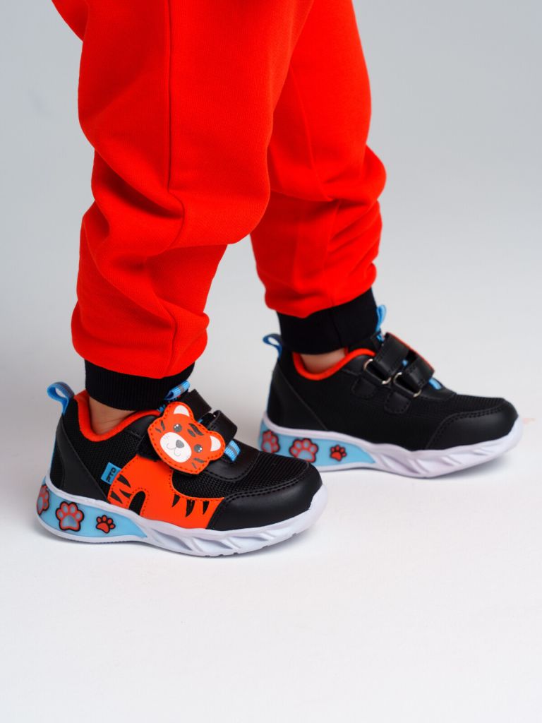 Кроссовки из дышащего текстиля и искусственной кожи. Текстильная подкладка из хлопка обладает высокой гигроскопичностью. Кожаная профилированная стелька с анатомической формой обеспечивает правильную нагрузку на стопу. На подошва светодиодные элементы. Модель имеет широкую удобную застежку липучку с мордочкой тигра. Формоустойчивый задник поддерживает стопу в правильном положении. Эргономичная форма колодки обеспечивает правильное формирование стопы ребенка.
