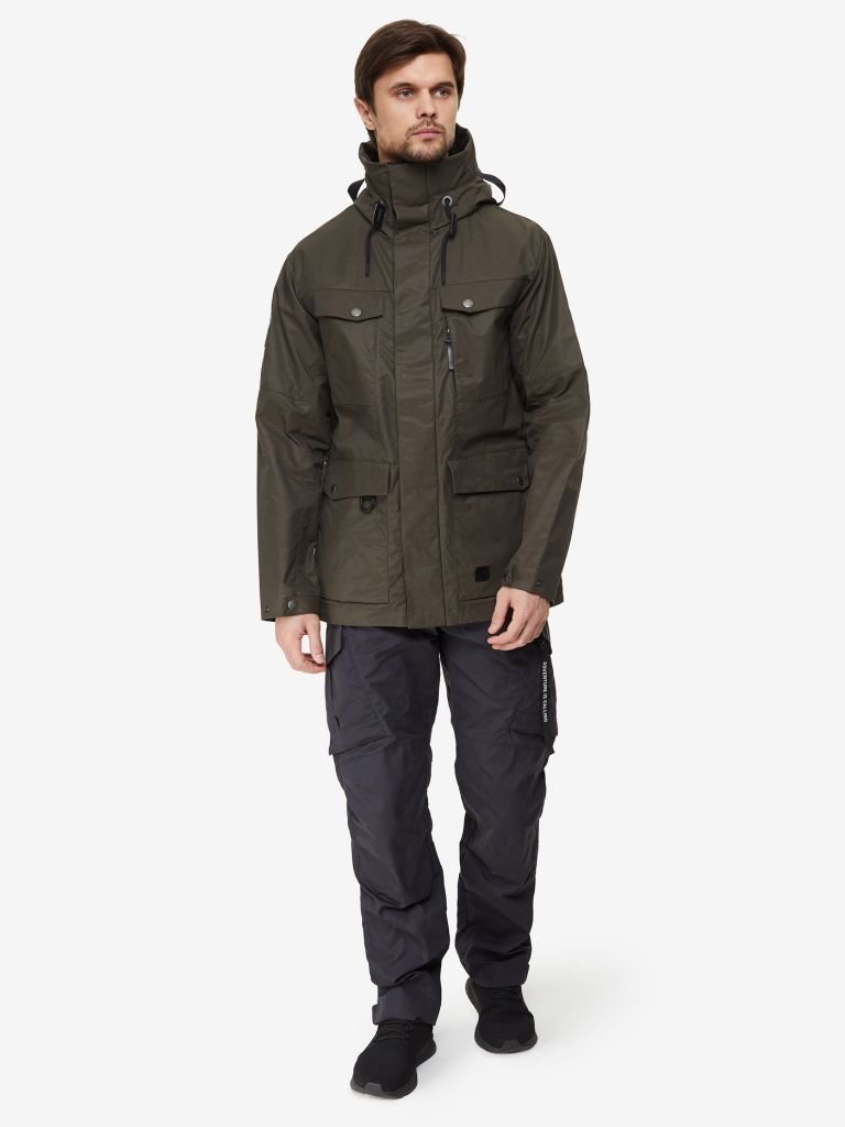 Мужская куртка из смесового материала с вощением в стиле классической военной куртки М65. Прочный материал отлично дышит и защищает от ветра и легких осадков. Центральная молния снаружи защищена ветрозащитной планкой на кнопках. 5 вместительных карманов. Объем капюшона легко регулируется, а специальный ветрозащитный тубус защищает шею от ветра. Утяжка по низу изделия препятствует проникновению холодного воздуха внутрь куртки. Манжеты регулируются патами на кнопках.