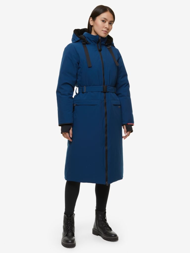 Теплое зимнее пальто с поясом и кокеткой. Благодаря мембранной верхней ткани пальто защищает от осадков и ветра. Натуральный пух бережно и без утяжеления сохраняет тепло в серьезные морозы.