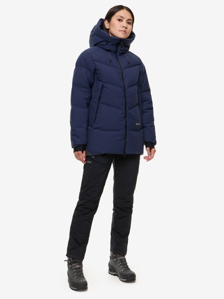 Удлиненная женская пуховка для альпинизма, туризма, активного отдыха, города. Максимальный комфорт и защита от непогоды при минимальном весе и объеме изделия. Легкая мембранная ткань прекрасно «работает» во влажных условиях, оберегая от ветра, мокрого снега и обеспечивая необходимую паропроницаемость, а высококачественный пух отлично сохраняет тепло, долго служит. Красивая вещь для любительниц спортивного образа жизни.
