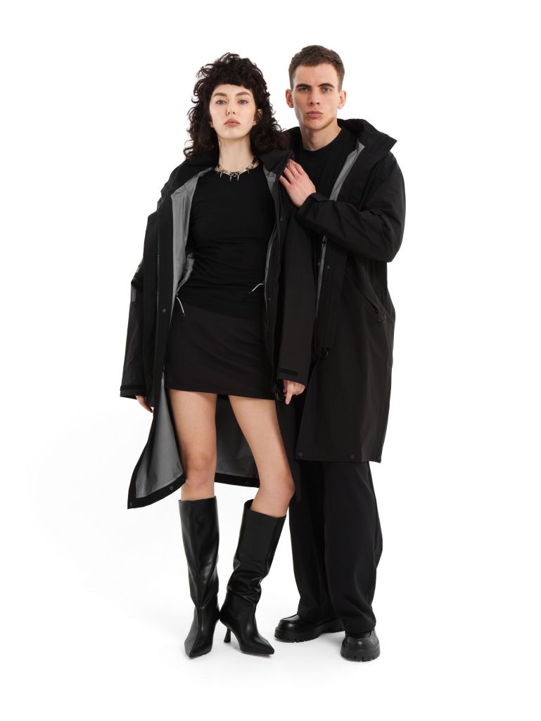 Технологичный тренч-трансформер из трёхслойной мембранной ткани с тактильным подкладом. Подол оснащён кнопками, благодаря которым форм-фактор меняется с «тренча до колена» на «куртку по пояс» за 10 секунд. Капюшон прячется в воротник-стойку.
