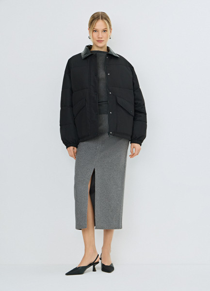 Утеплённая куртка из искусственной кожи с меховым воротником, Черный