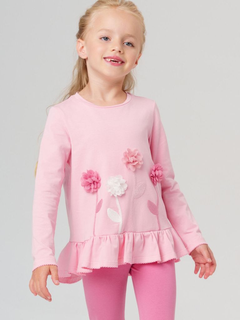 Розовый лонгслив для девочек с вышивкой и 3D цветами от PlayToday — удобная и нарядная вещь, которая украсит каждый день.