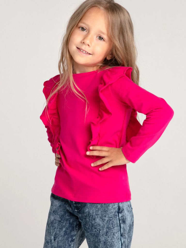 Лонгслив из качественного и приятного на ощупь трикотажа джерси. Высокое содержание хлопка 95%. Благодаря наличию эластана в составе ткани, изделие проще в уходе и держит форму. Модель декорирована воланами.
