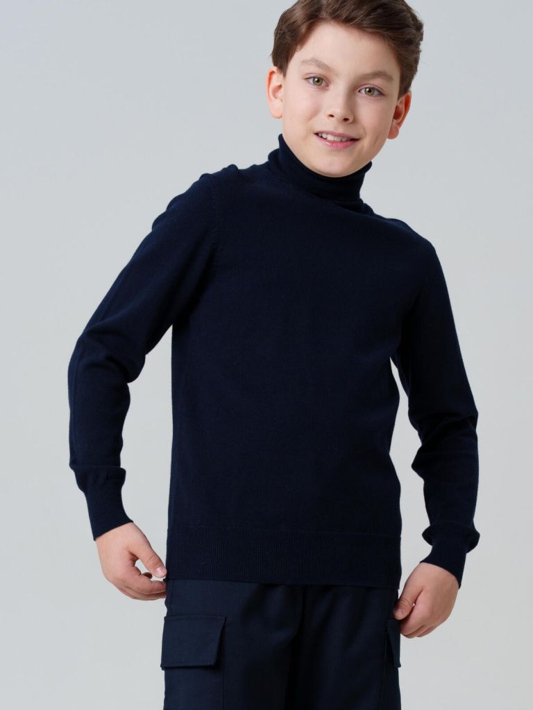 Прямой силуэт не сковывает движений, а горловина мягко облегает шею и хорошо держит форму. Такая темно-синяя детская водолазка с высоким воротом для мальчиков легко комбинируется с рубашками, джемперами, пиджаками, жилетами и школьной формой в целом.