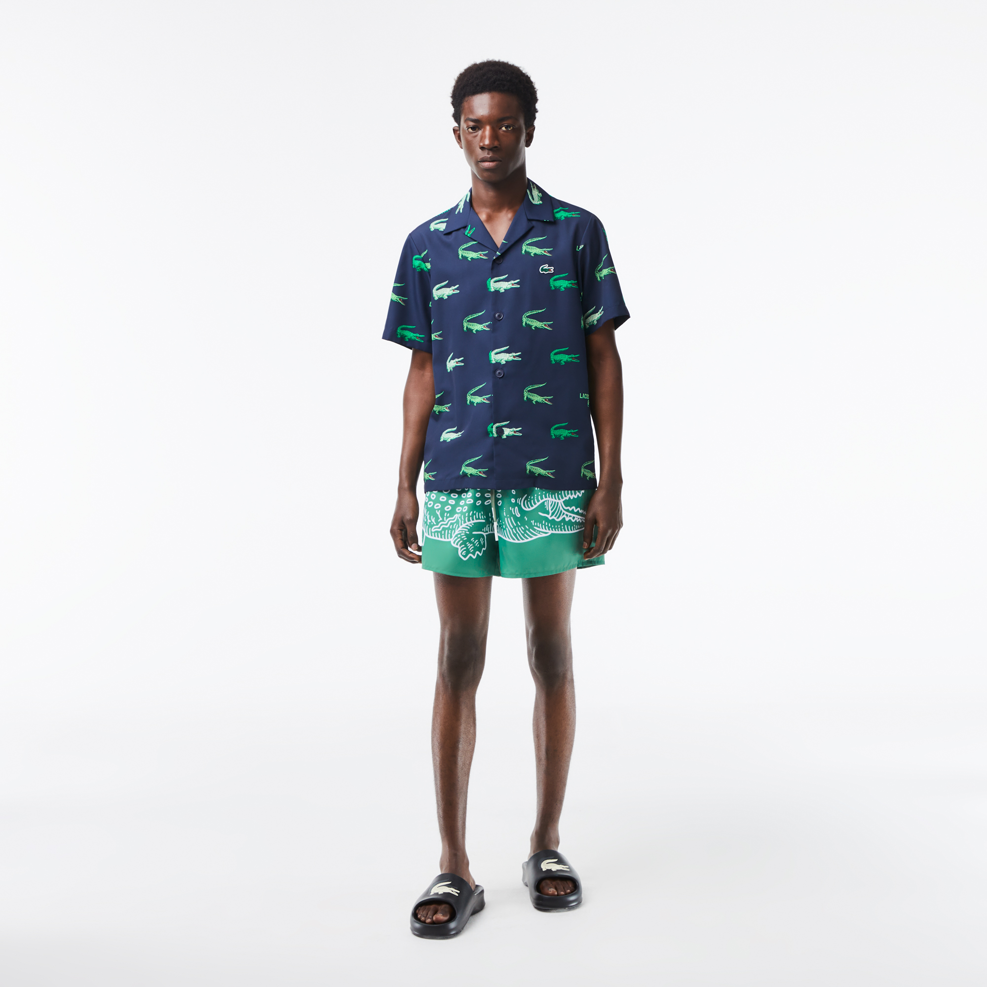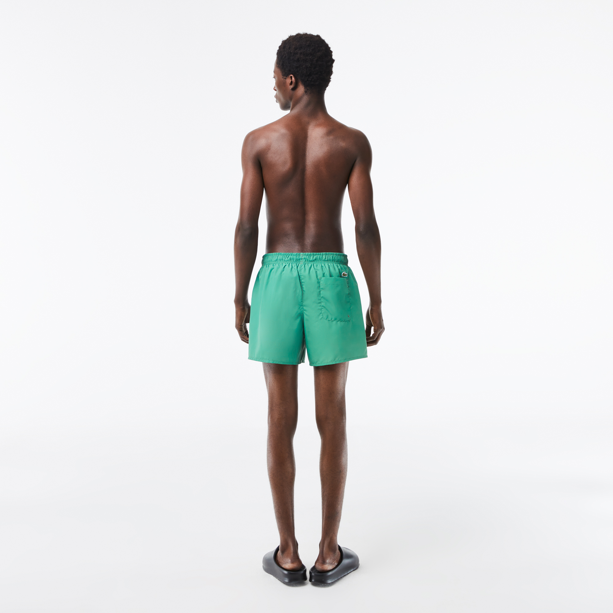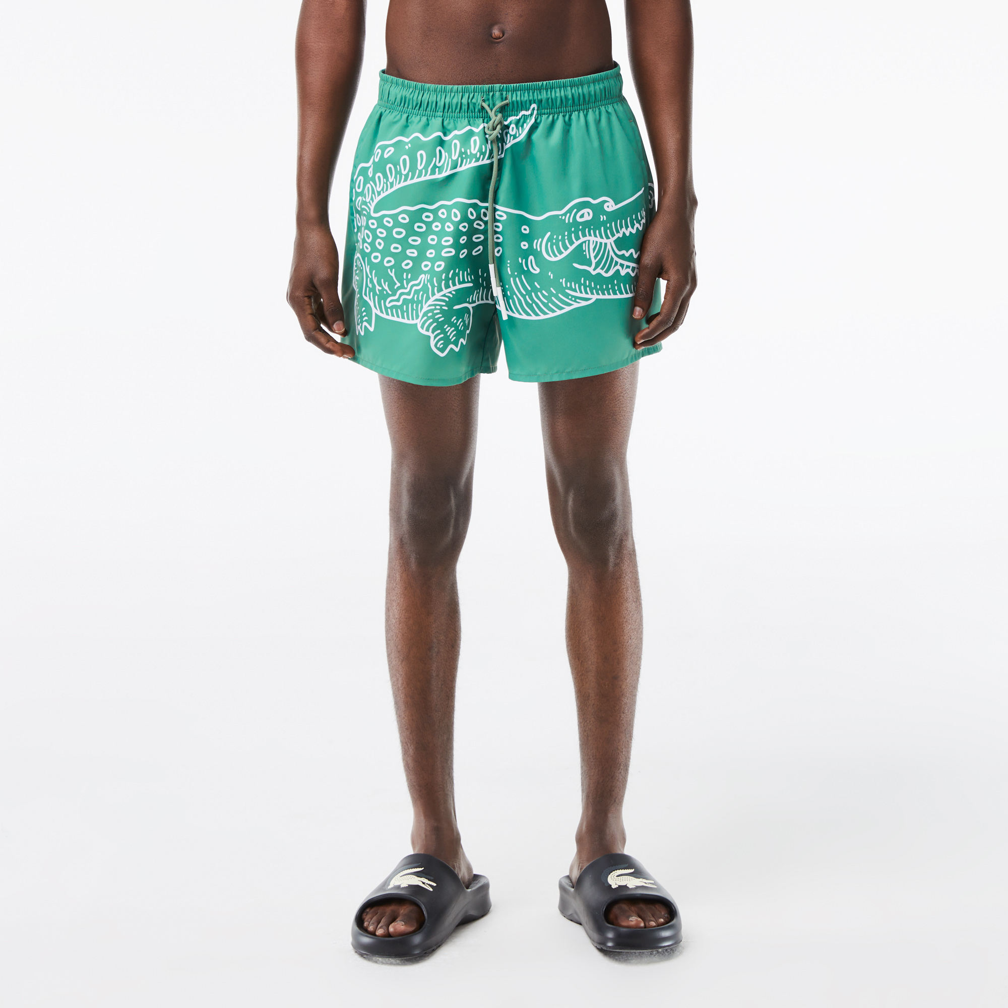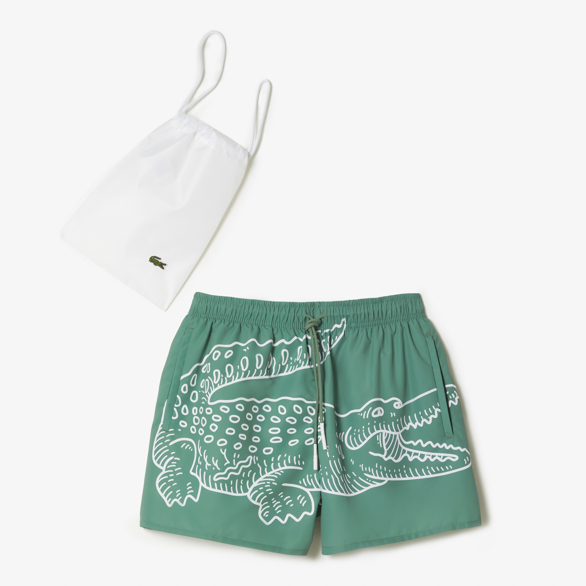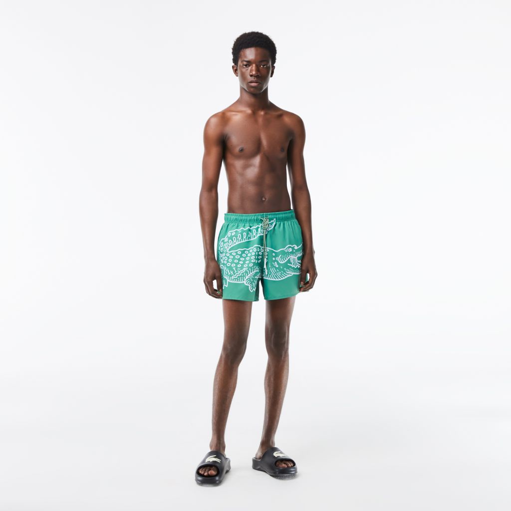 Мужские плавки с крокодиловым принтом Lacoste \ Эластичная талия со шнурком \ Встроенные сетчатые плавки \ Внутренний карман с застежкой на крючок и петлю \ Логотип крокодила сзади \ Переработанный полиэстер \ Материал: 100% переработанный полиэстер