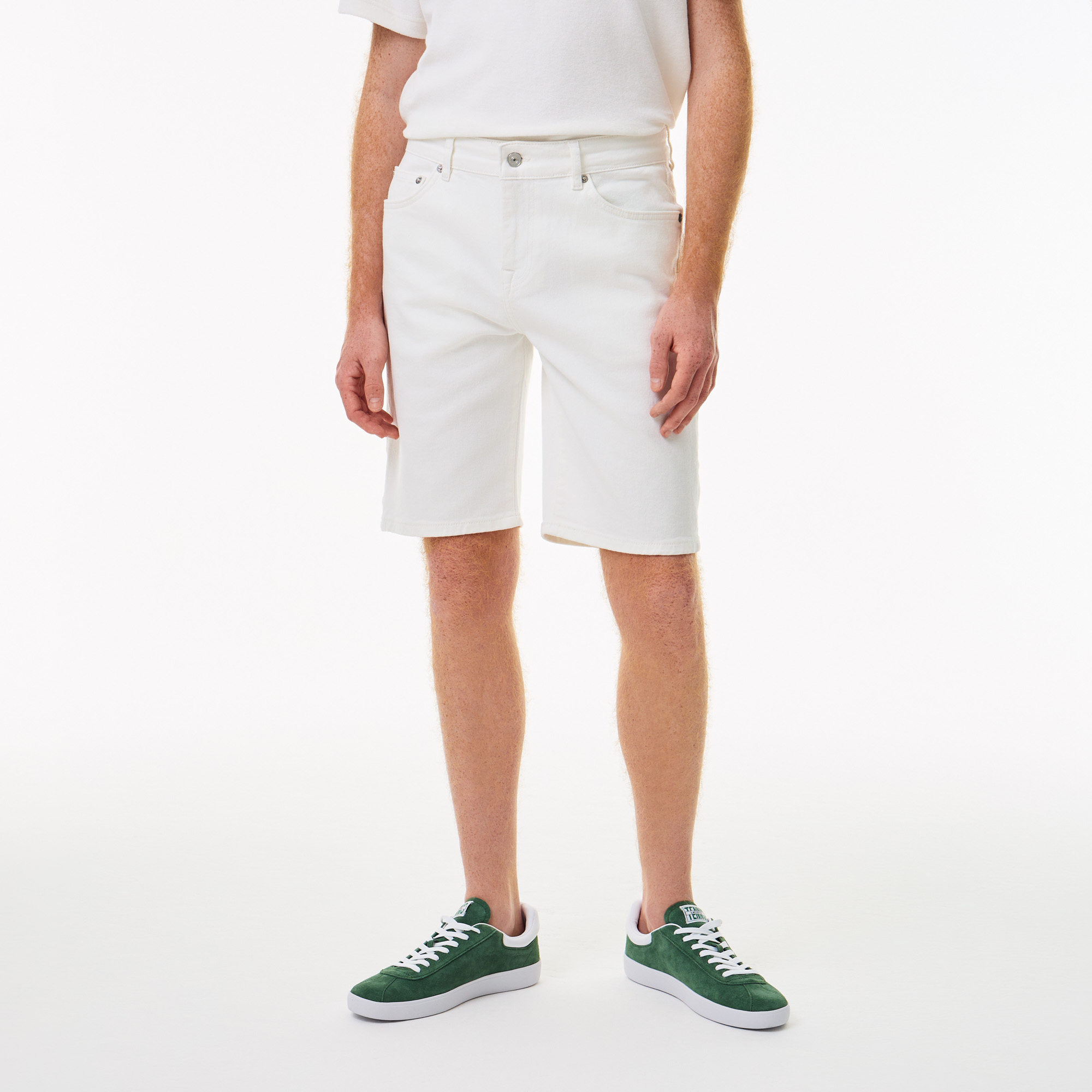 Мужские шорты-бермуды из эластичного хлопкового денима Slim Fit \ Приталенный крой \ Эластичный хлопковый деним \ Пять карманов \ Ширинка на молнии с фирменной металлической пуговицей и этикеткой Lacoste сзади \ Вышитый зеленый крокодил на заднем кармане