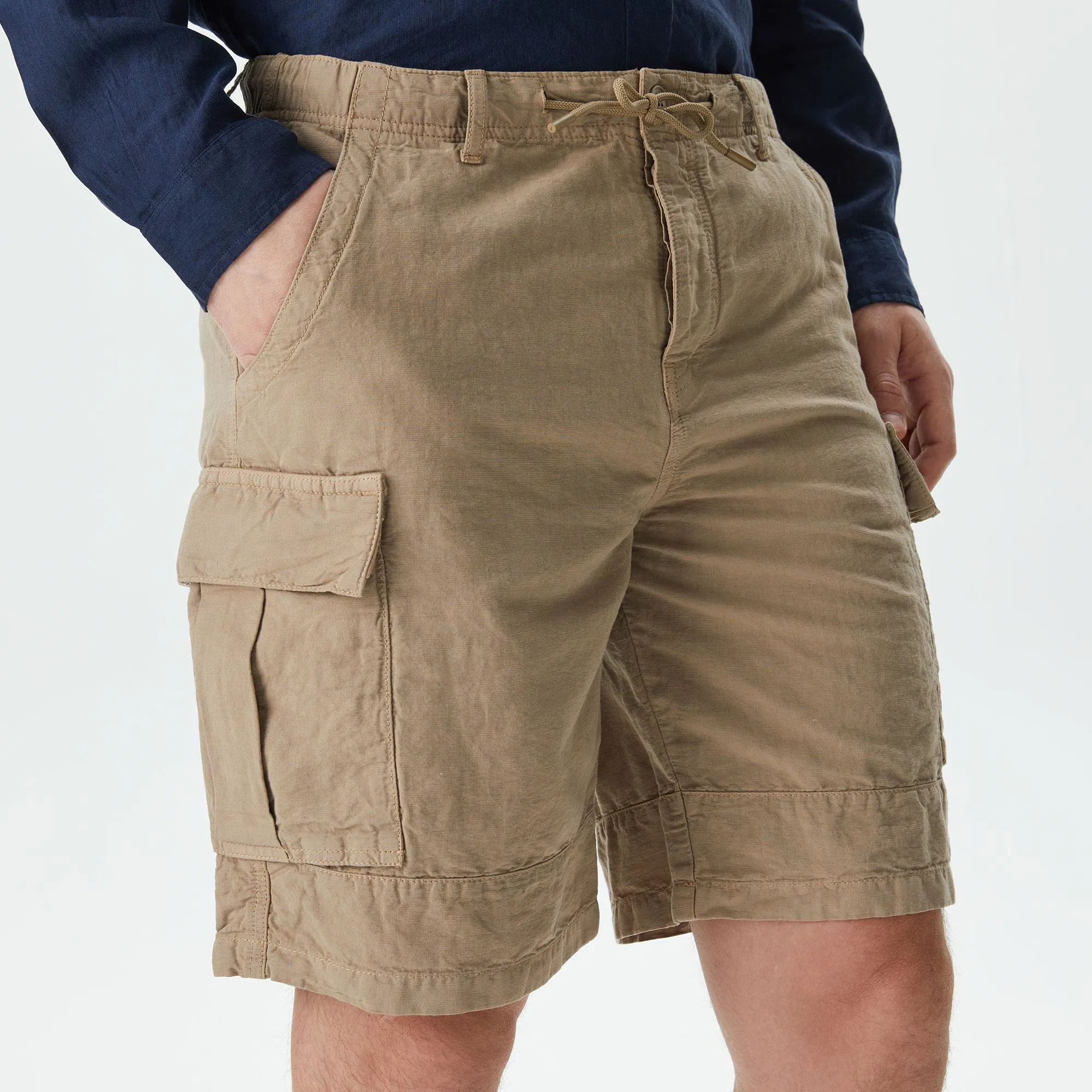 Пояс с регулируемой кулиской\Прорезные и накладные карманы\Логотип в тон изделия сзади\Материал: верх-61% хлопок 39% лен\Рост модели 187 см, размер одежды 40
