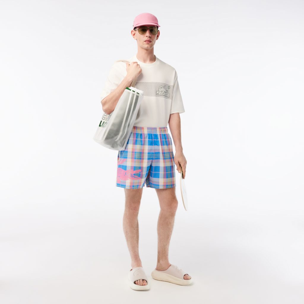Мужские плавки Lacoste Quick Dry в цветную клетку \ Эластичный пояс со шнурком \ Плавки из встроенной сетки \ Внутренний карман с застежкой на крючок и петлю \ Логотип крокодила сзади, прозрачная крокодиловая вставка на ноге \ Переработанный полиэстер \