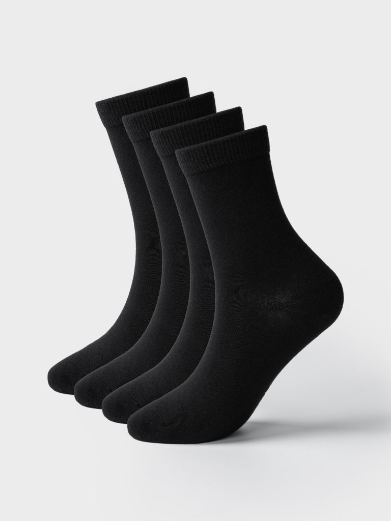 Универсальный дизайн набора включает 4 пары чёрных носков — удобно комбинировать с кедами, кроссовками, школьной обувью и спортивной формой. Такой набор носков для мальчика отлично подойдёт как на каждый день, так и в школу, и в поездку.