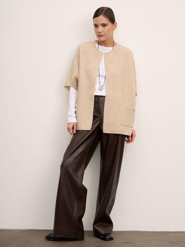 Элегантное пончо из натурального кашемира выполнено в утончённом оттенке латте-белый. Модель отличается лаконичным дизайном и свободным силуэтом, который мягко драпируется и создаёт ощущение уюта и комфорта. Идеальный вариант для многослойных образов в прохладное время года.