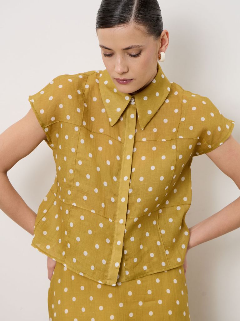 Модель с аккуратным отложным воротником и короткими рукавами. Застёжка на пуговицы по передней планке делает блузу удобной и практичной. Классический принт в горошек придаёт образу лёгкость и ретро-эстетику, а лаконичный крой подчёркивает элегантность изделия.
