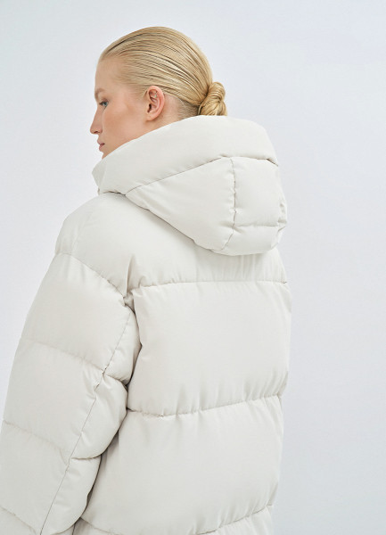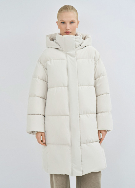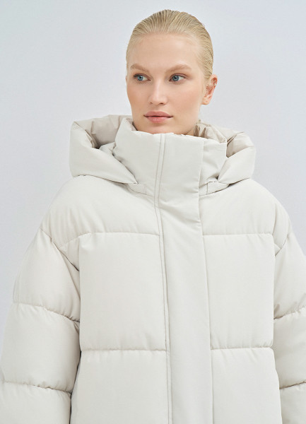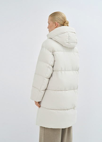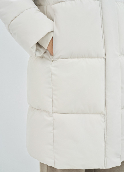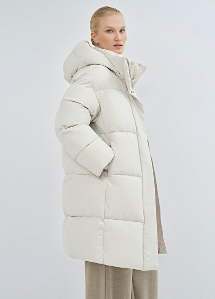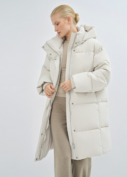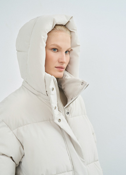 Длинный стёганый пуховик с капюшоном, Бежевый