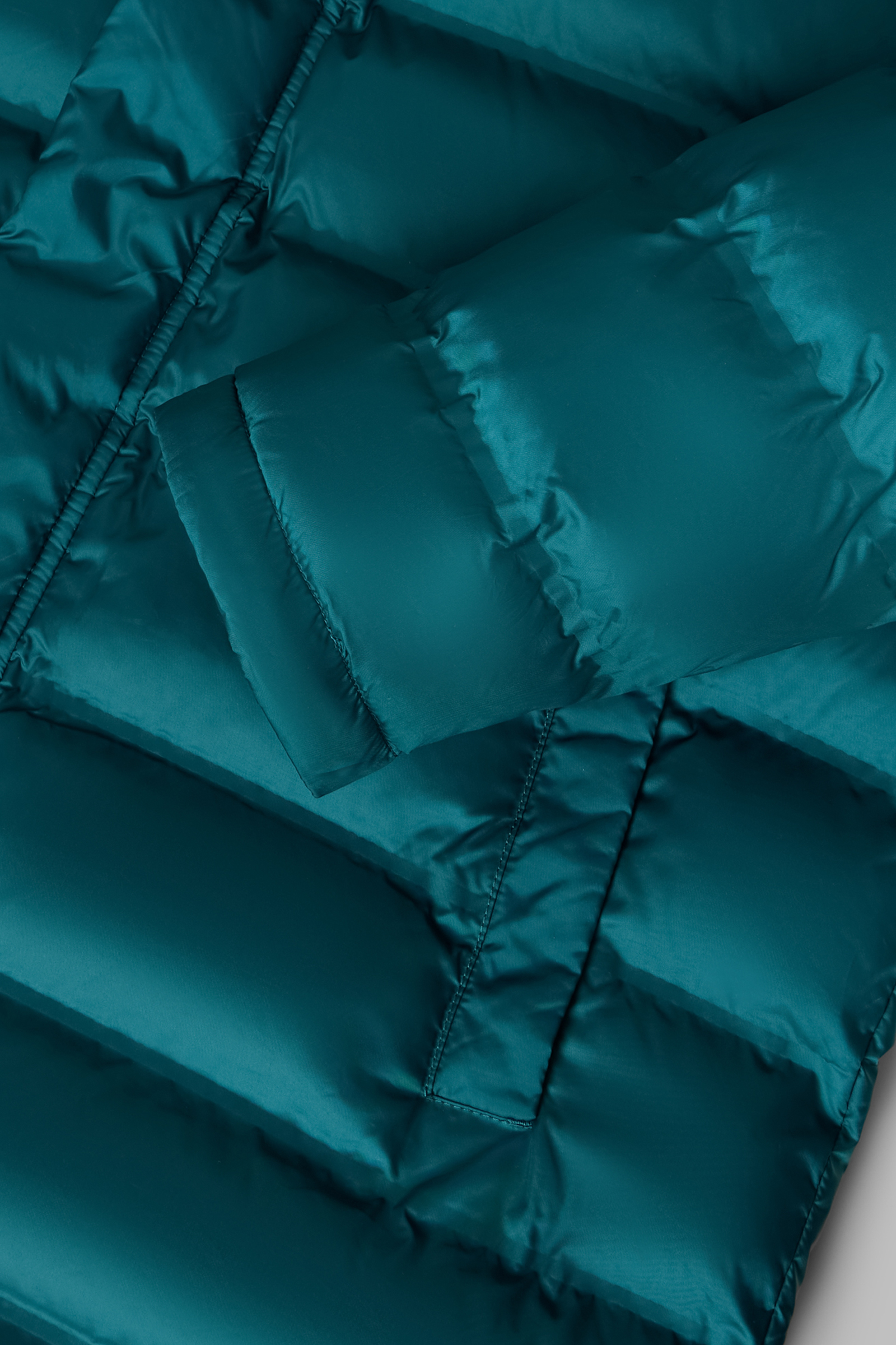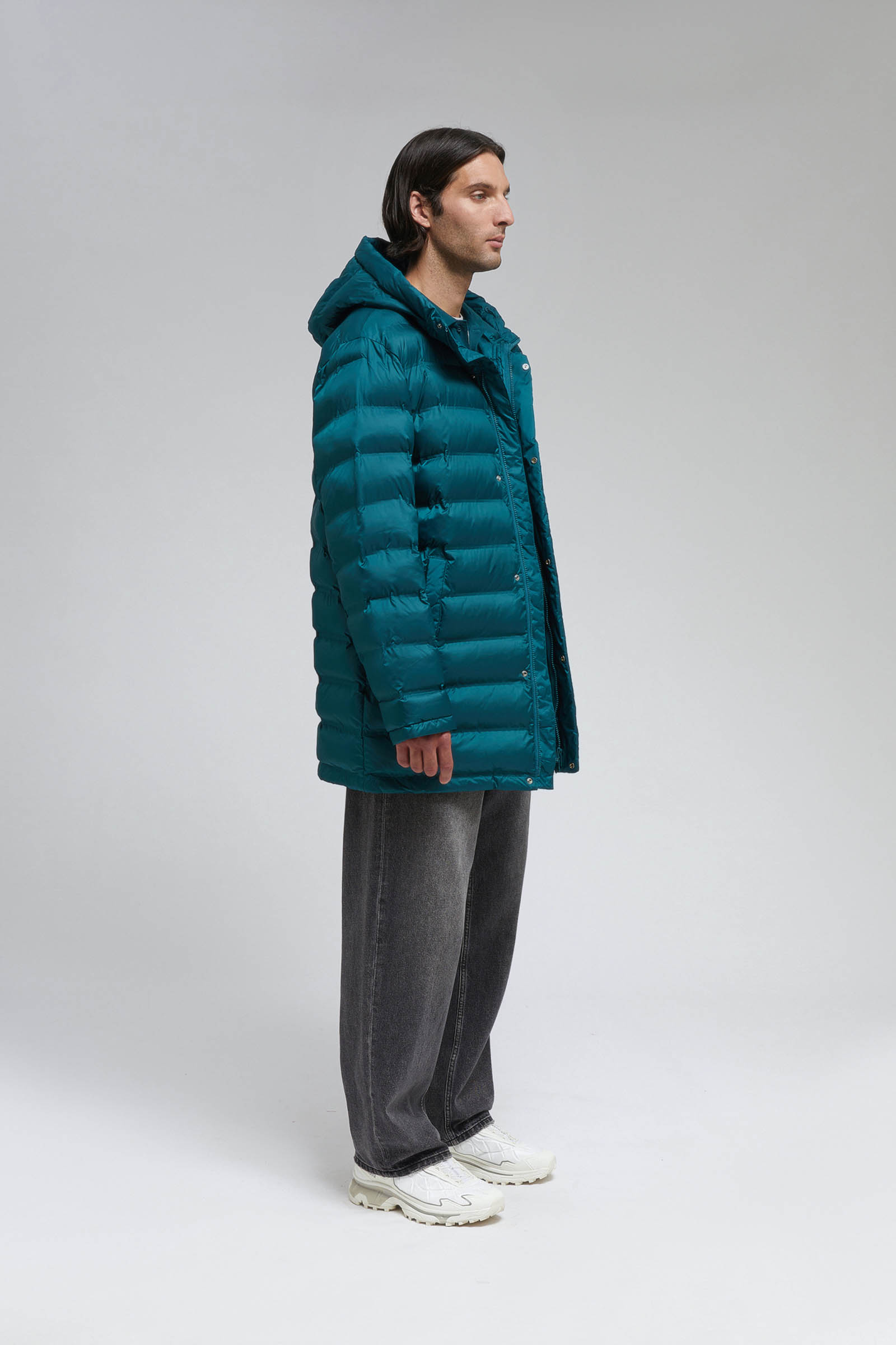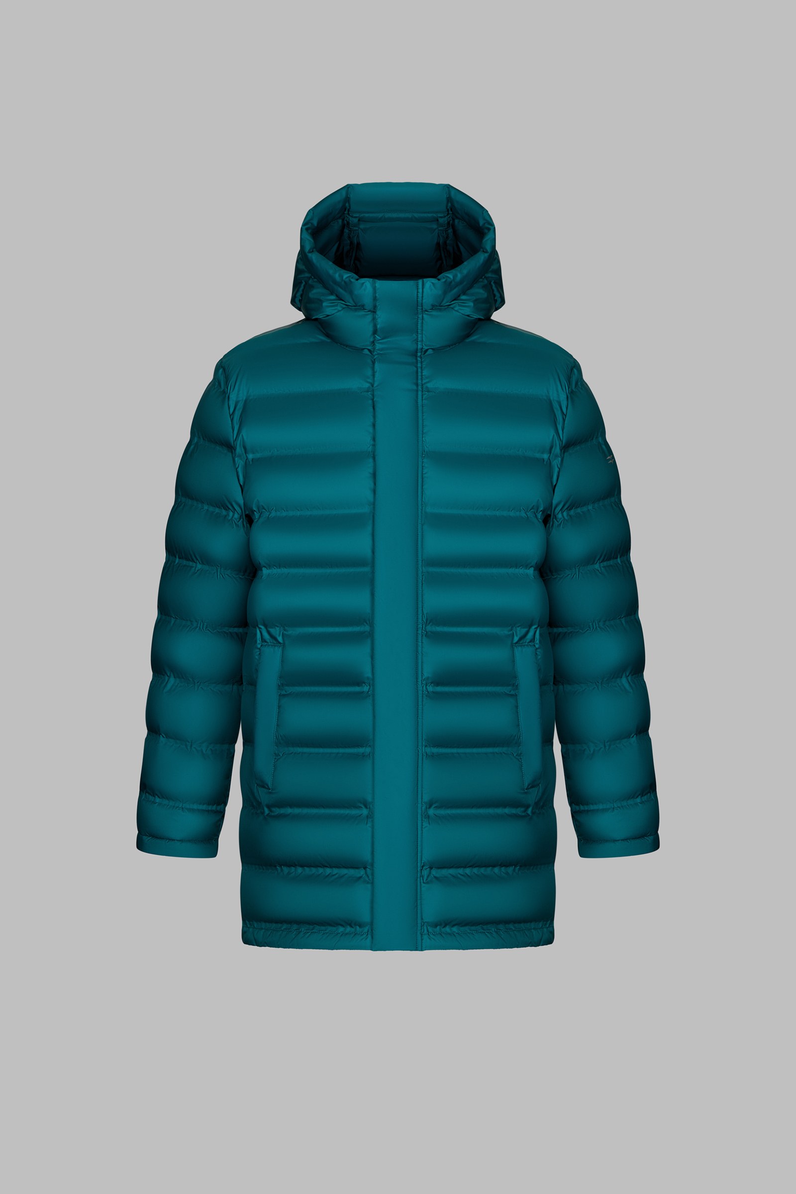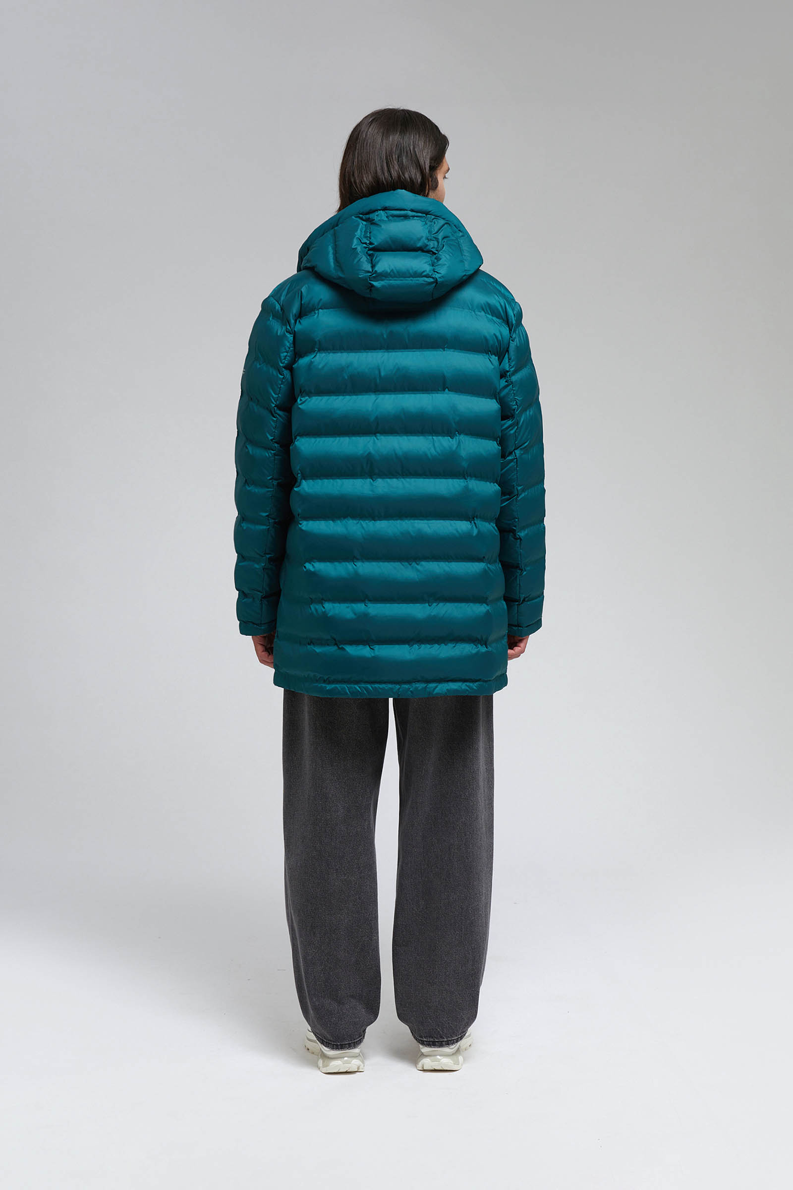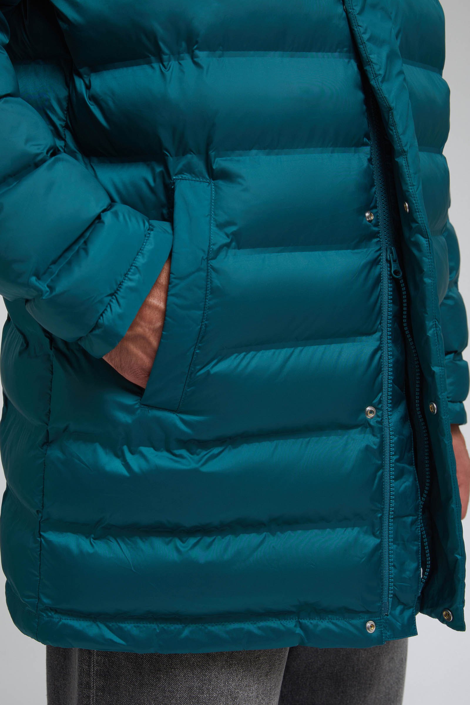 Пуховое полупальто с накладными карманами и капюшоном