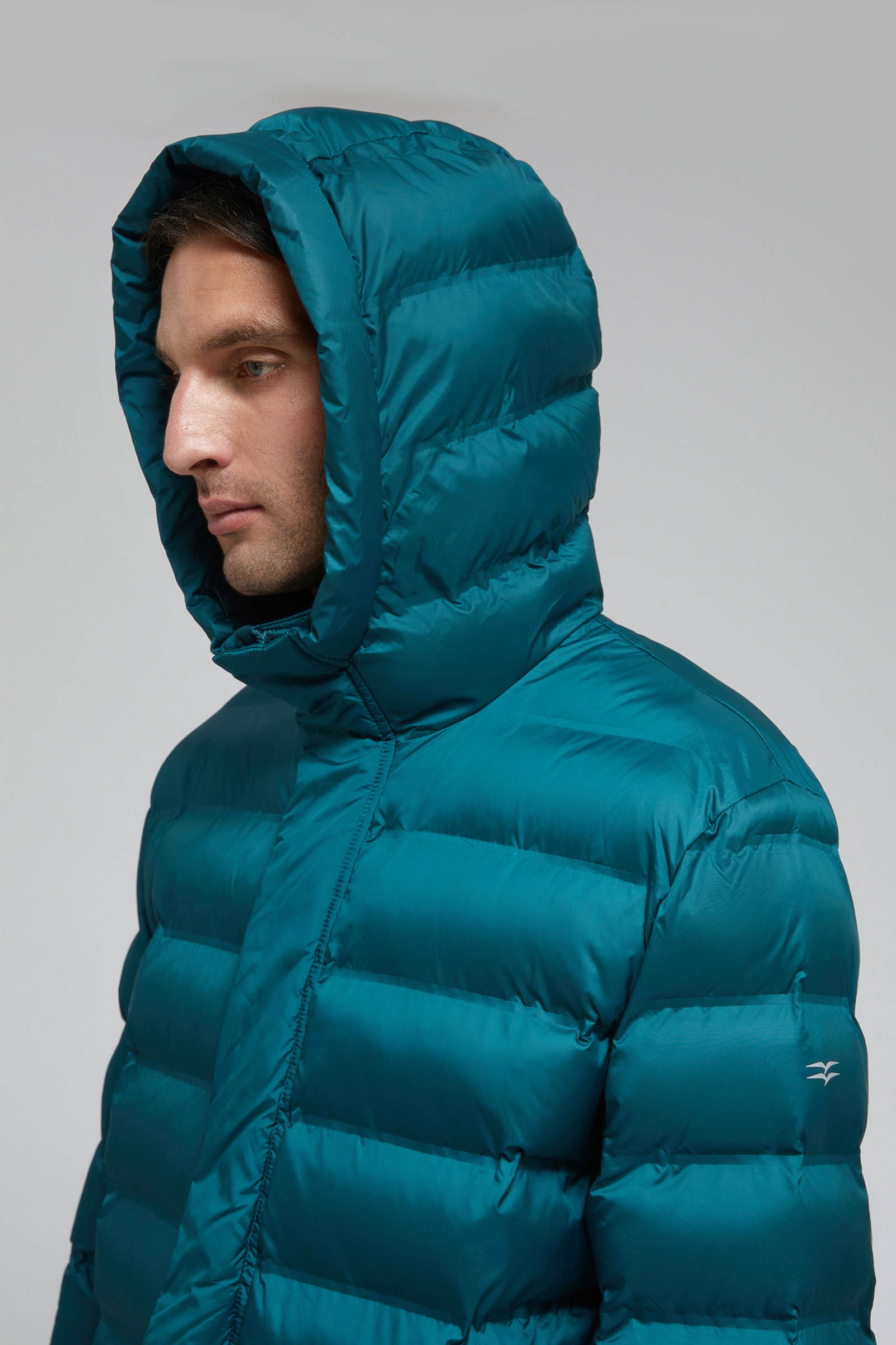 Пуховое полупальто с капюшоном и воротником-стойкой