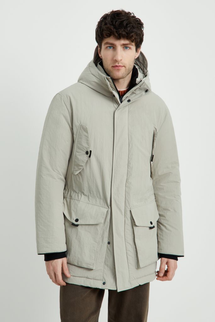 Пуховое полупальто с капюшоном и воротником-стойкой