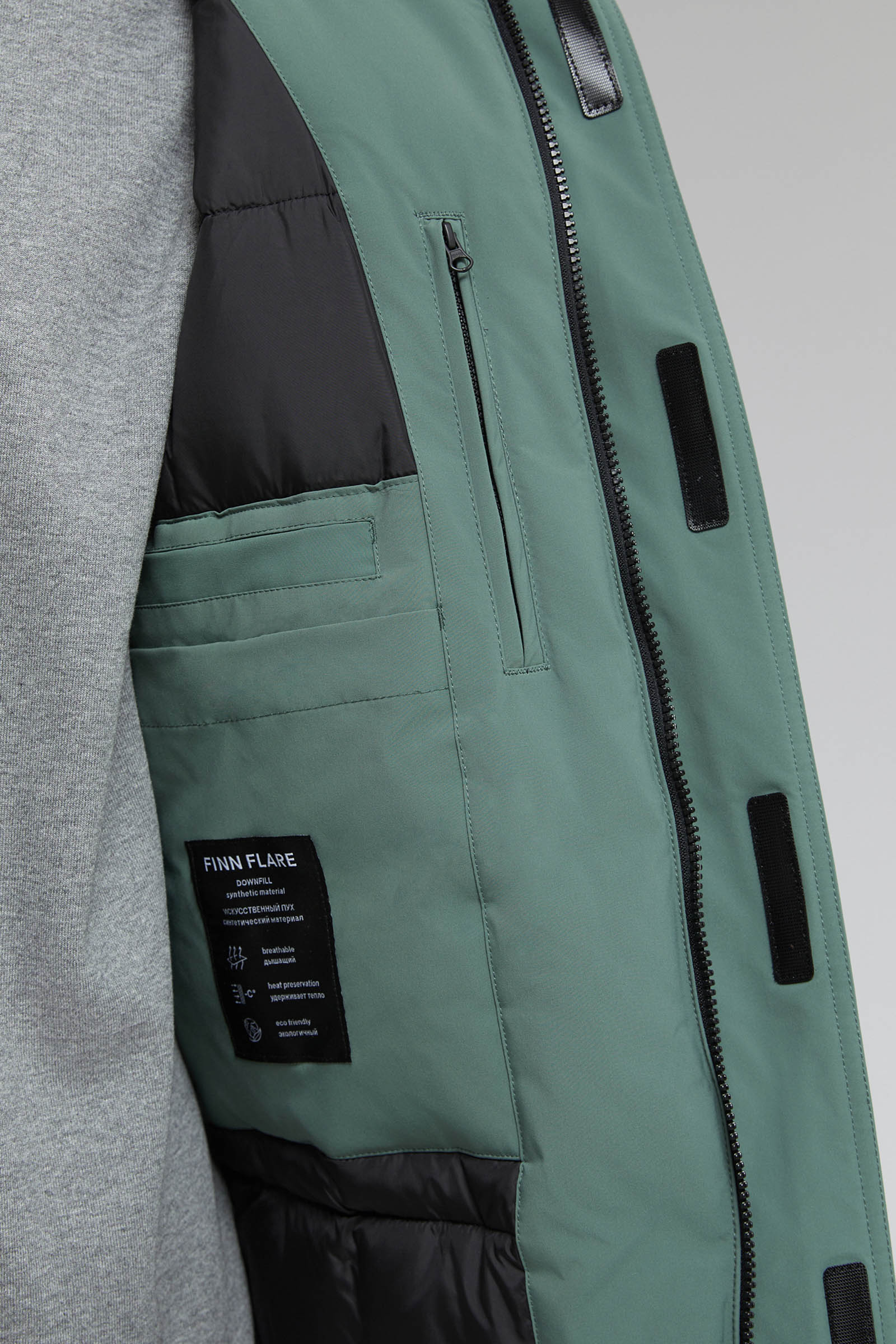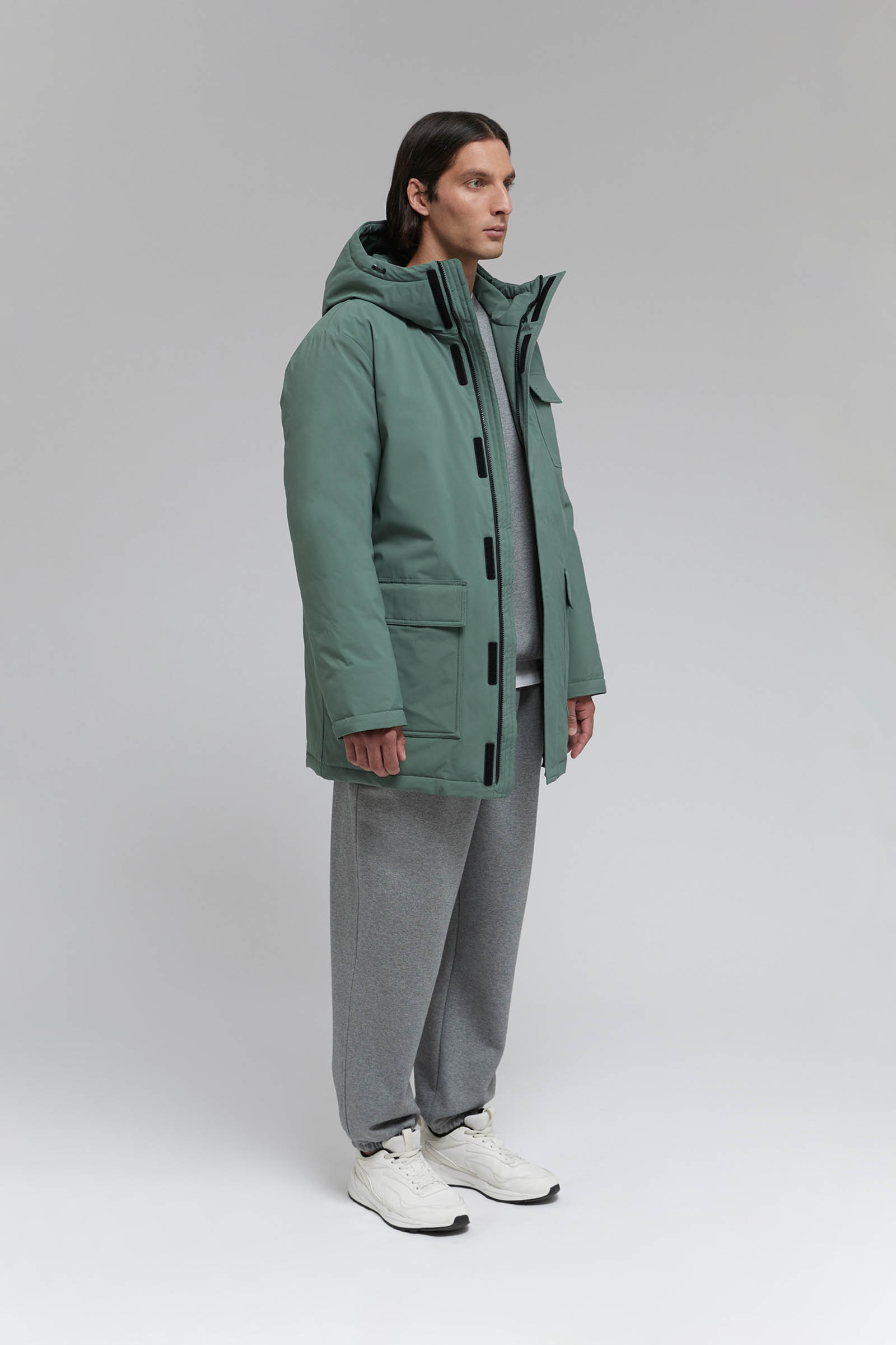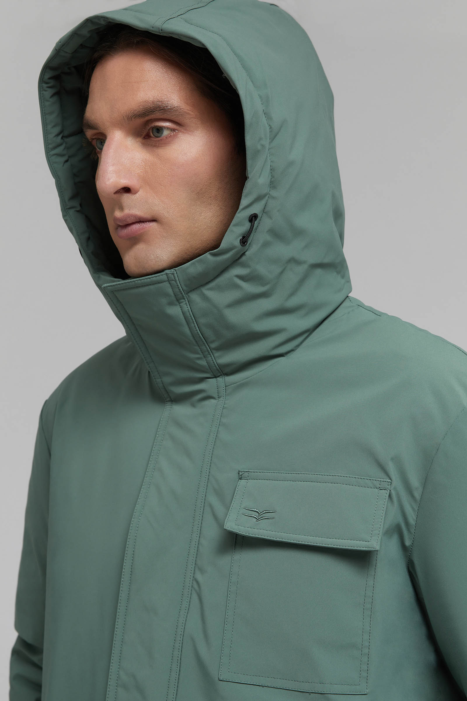 Пуховое полупальто с капюшоном и воротником-стойкой