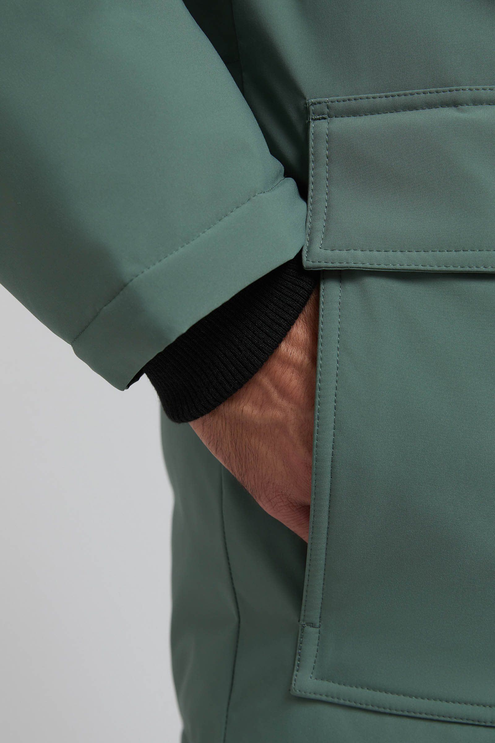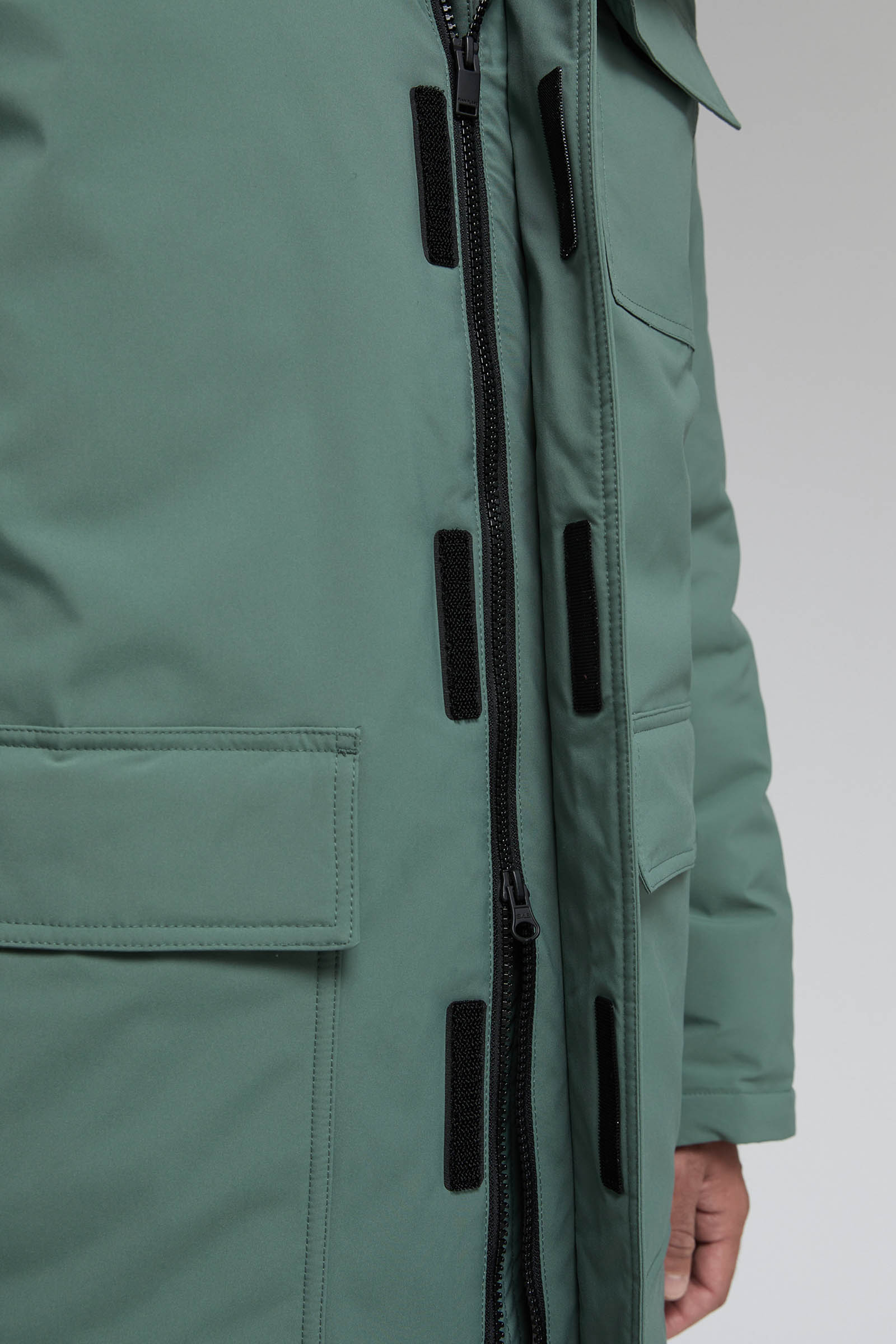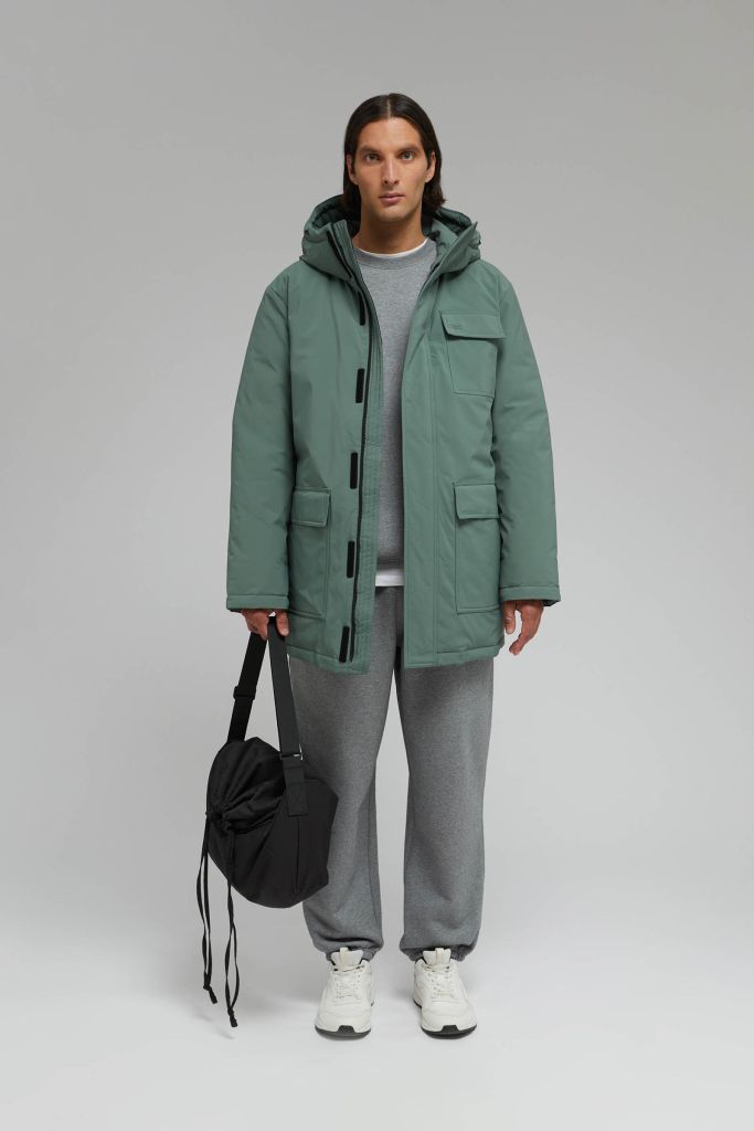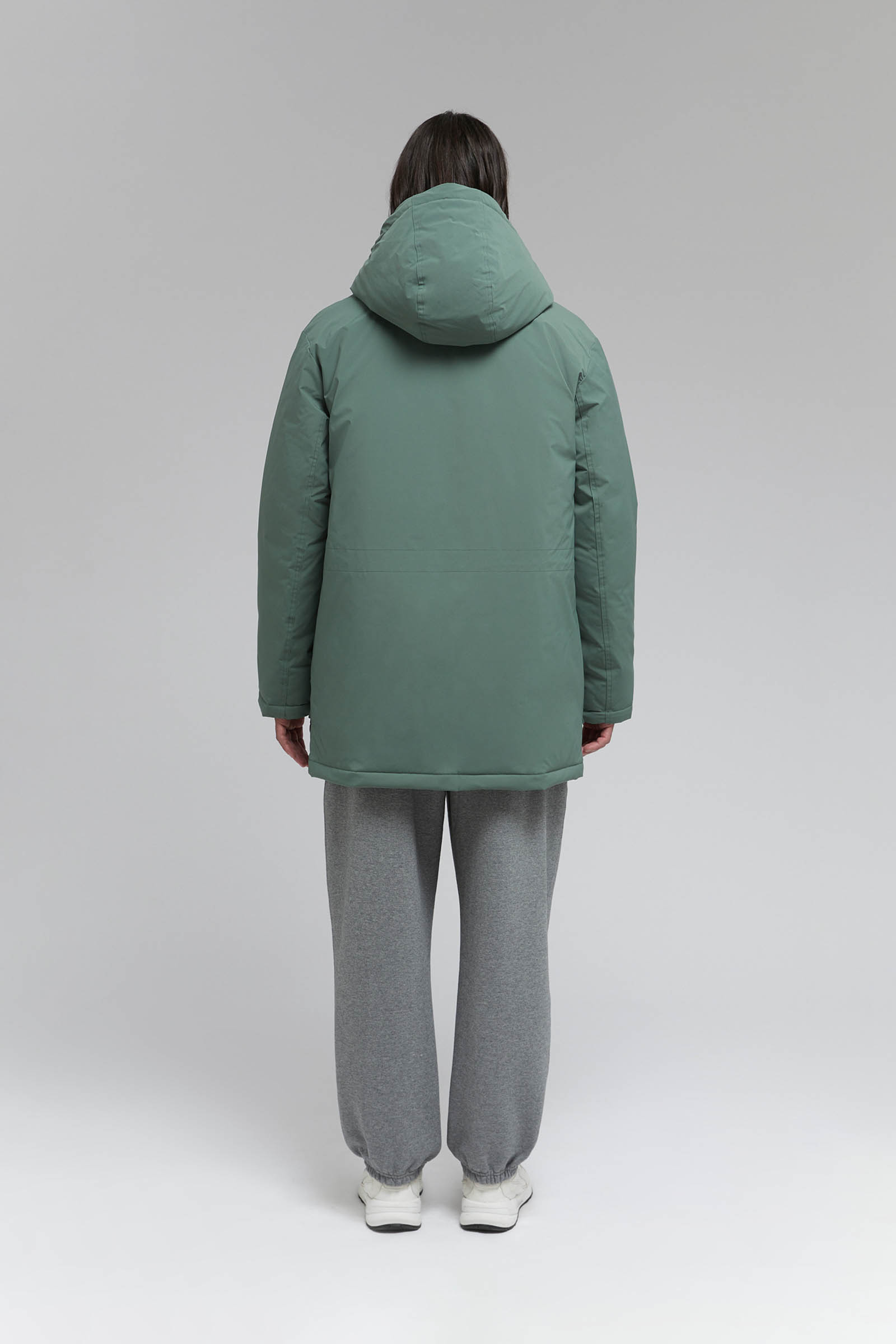 Пуховое полупальто с капюшоном и воротником-стойкой