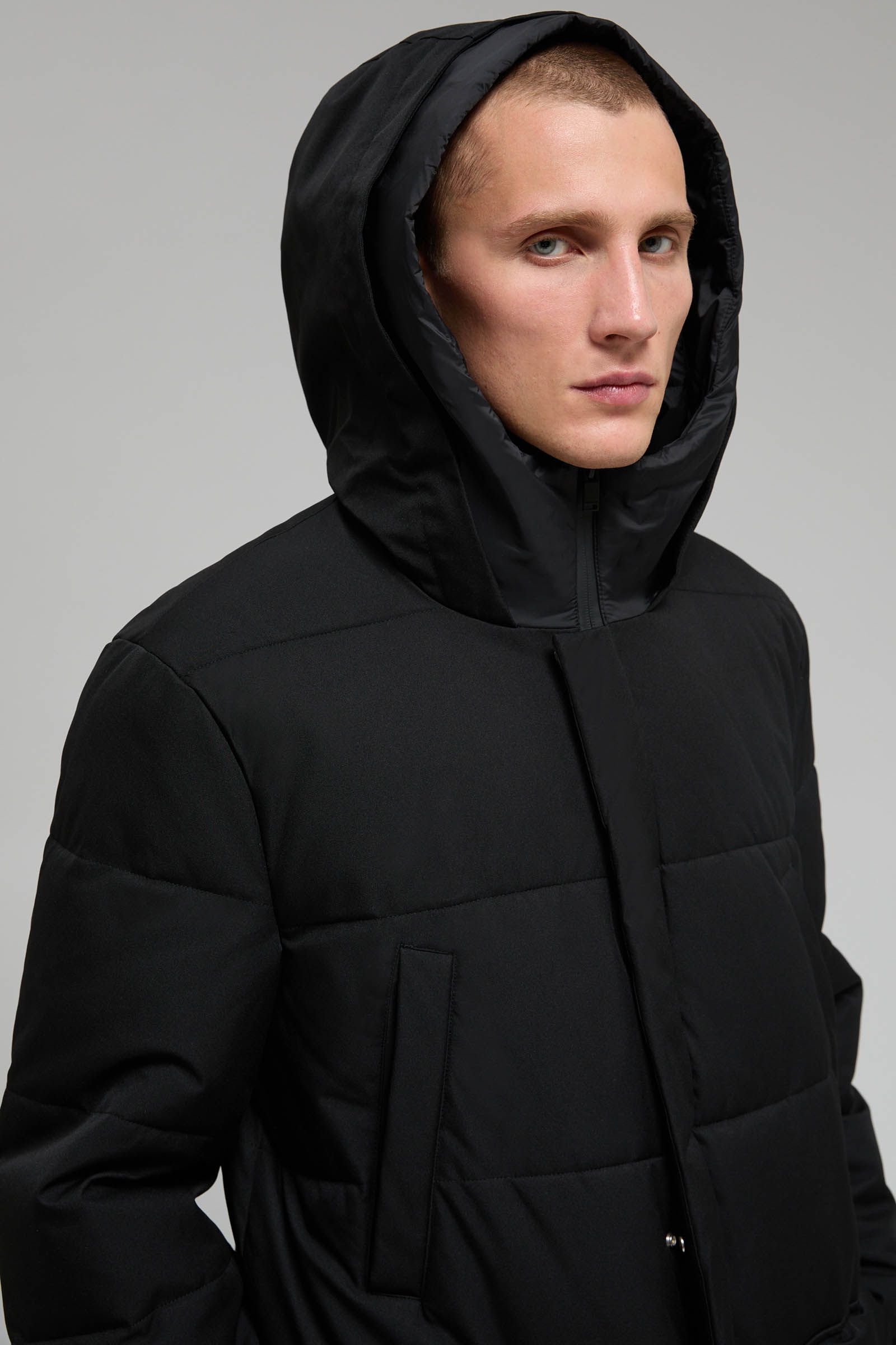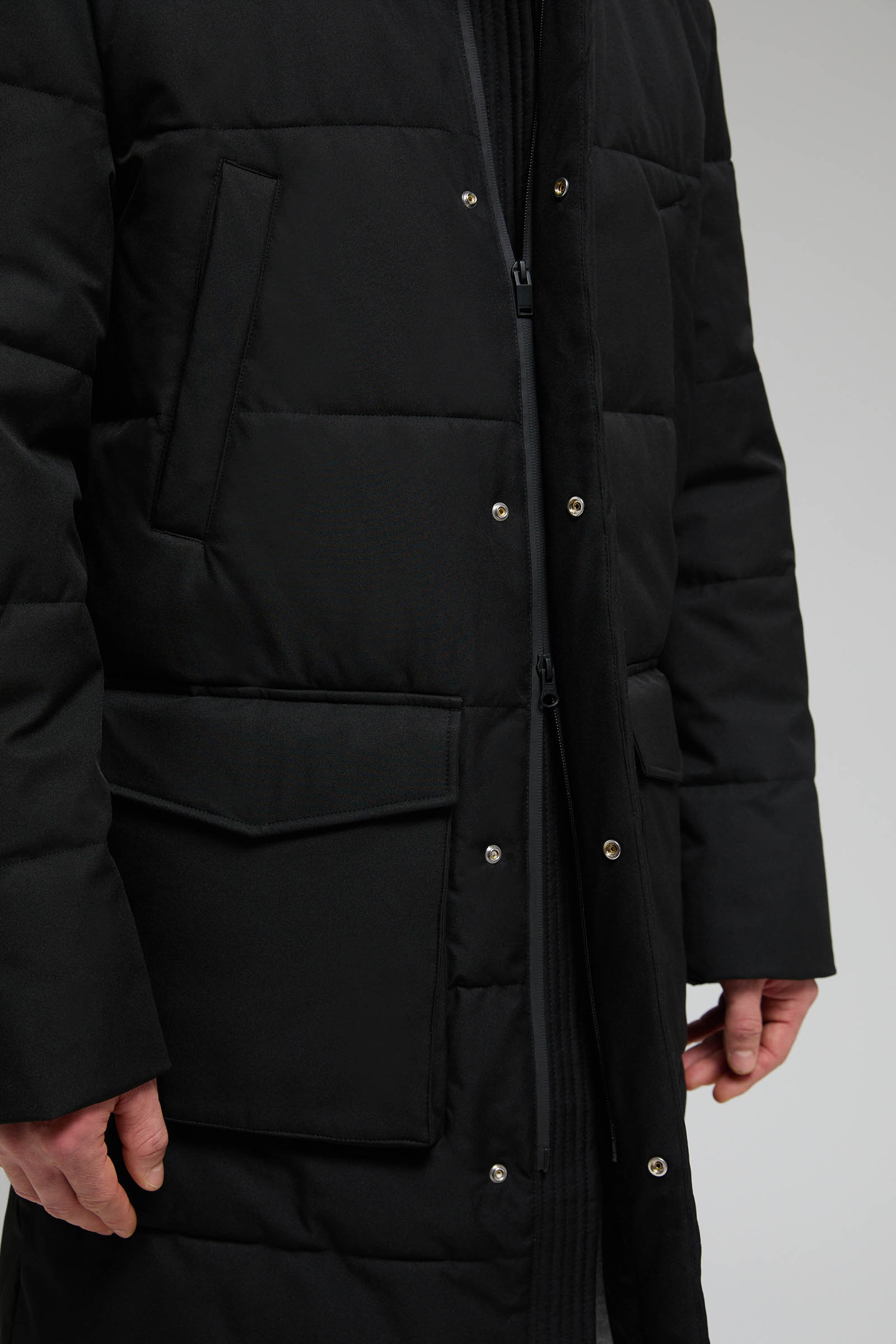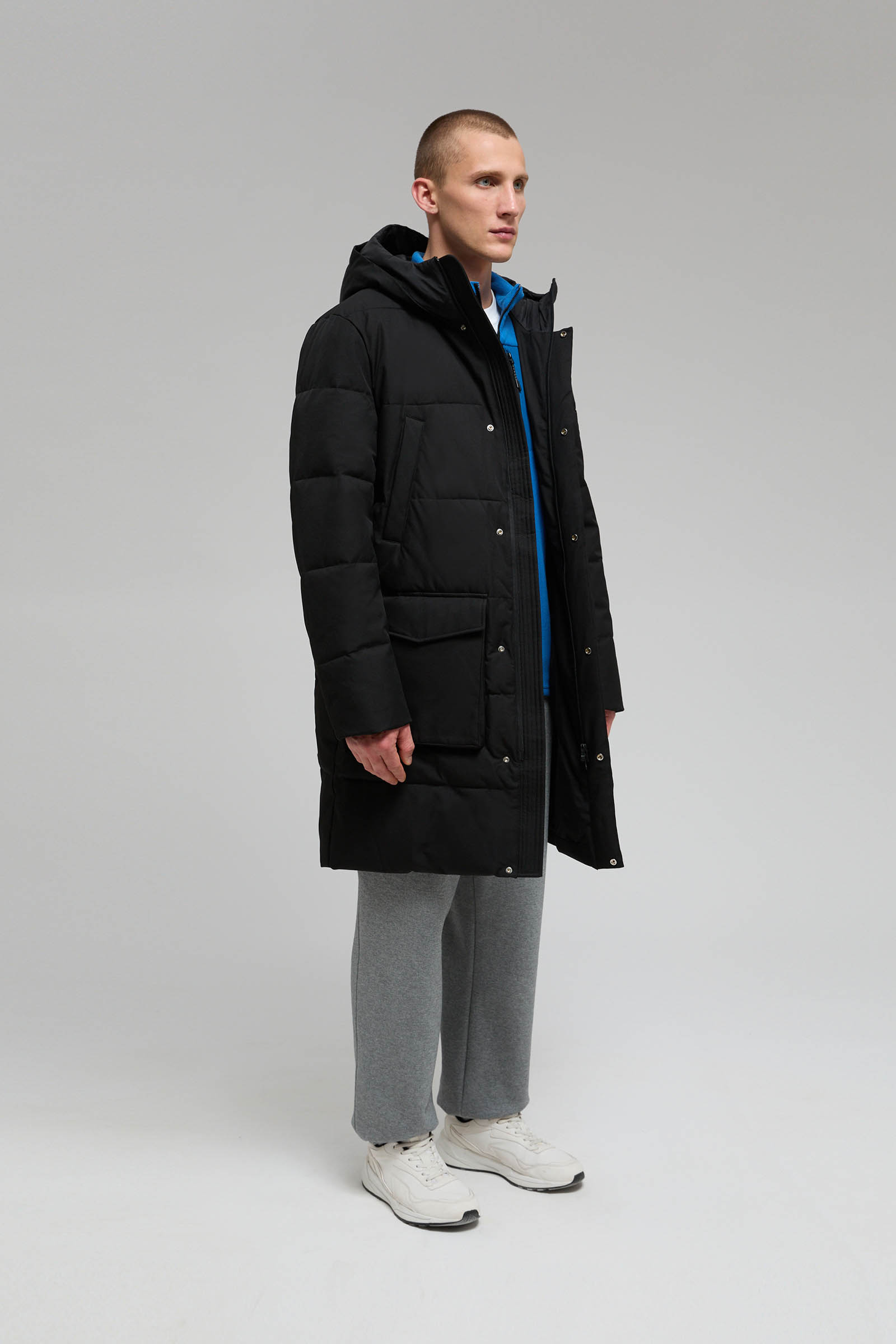 Пуховое полупальто с накладными карманами и капюшоном