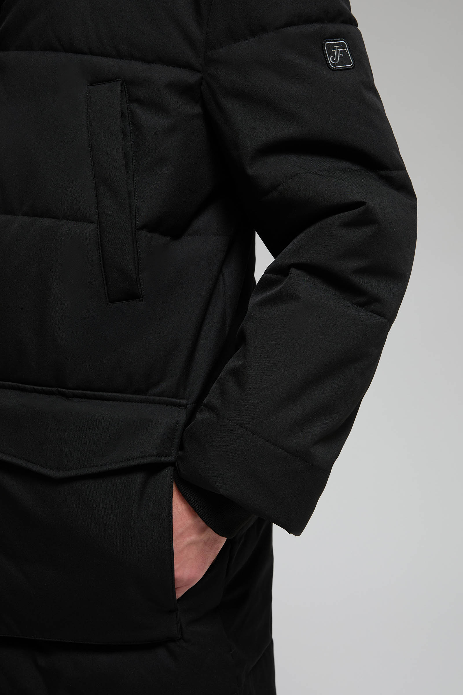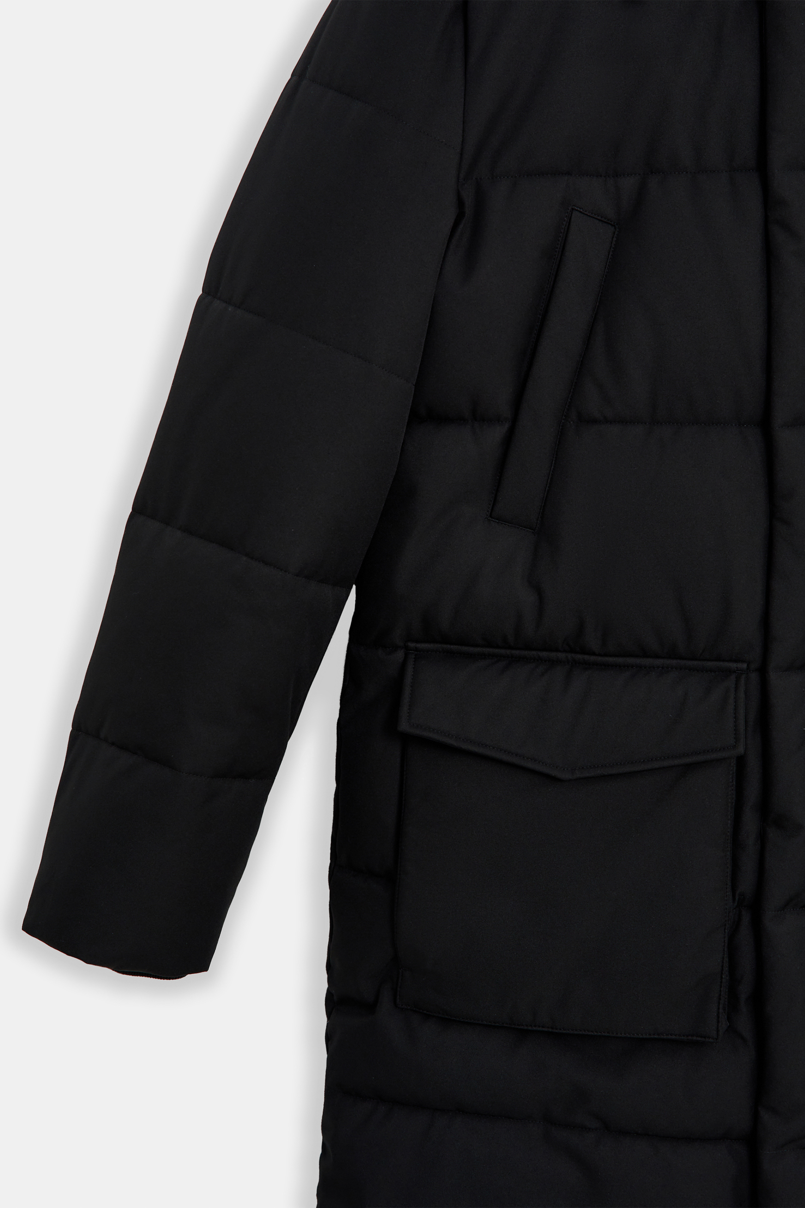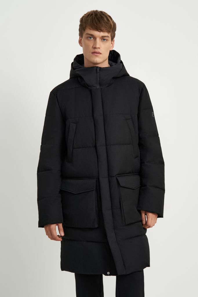 Пуховое полупальто с накладными карманами и капюшоном