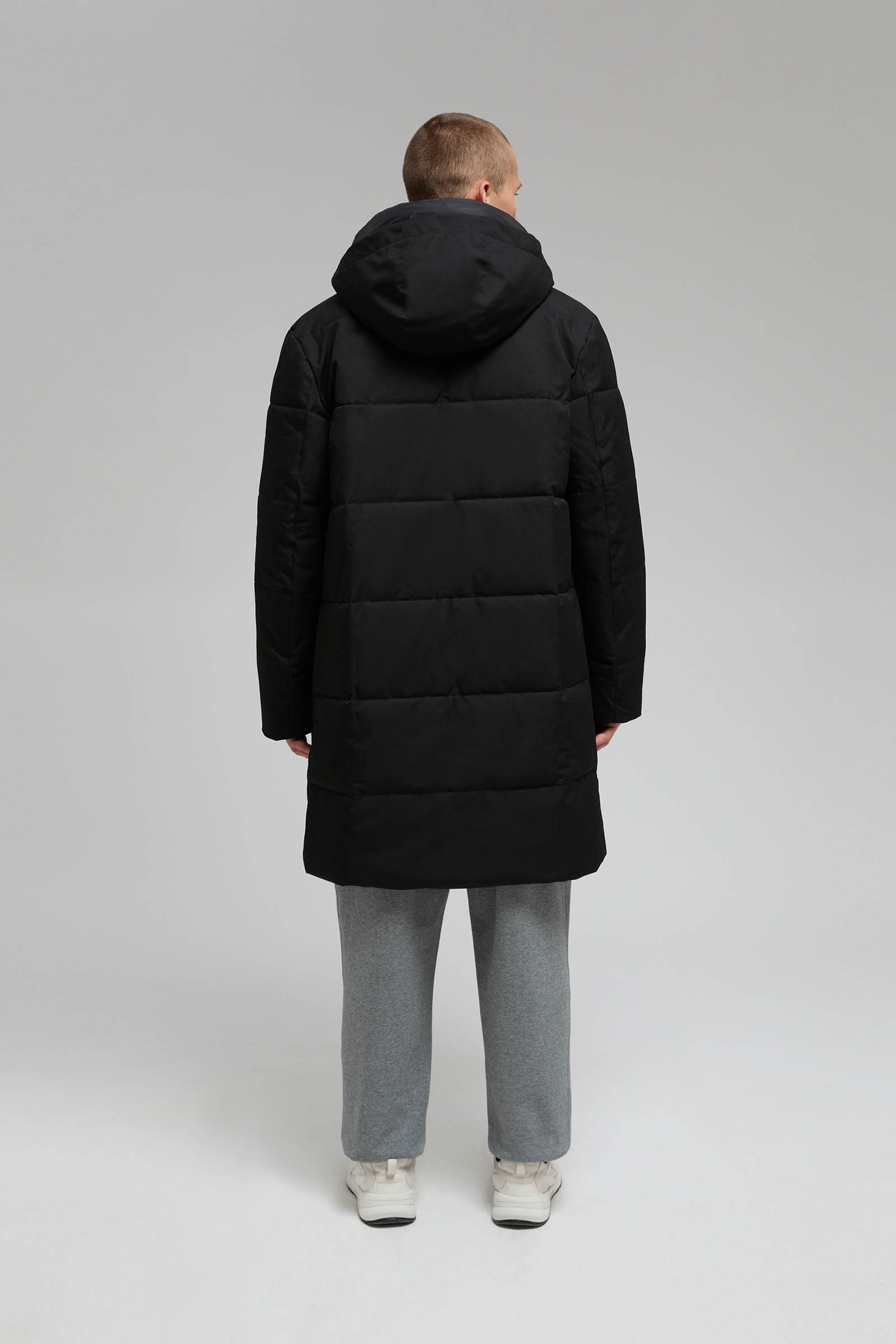 Пуховое полупальто с капюшоном и воротником-стойкой