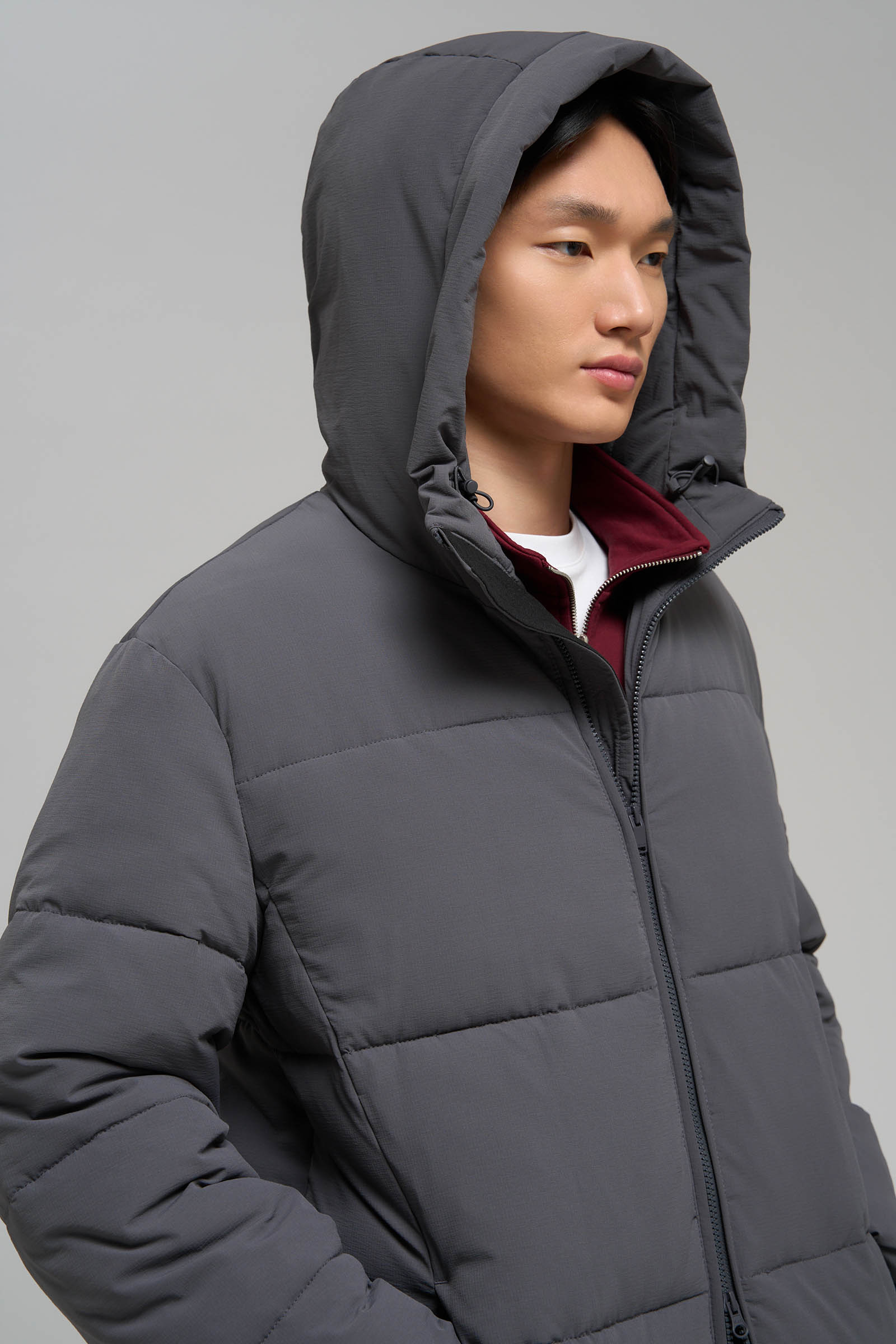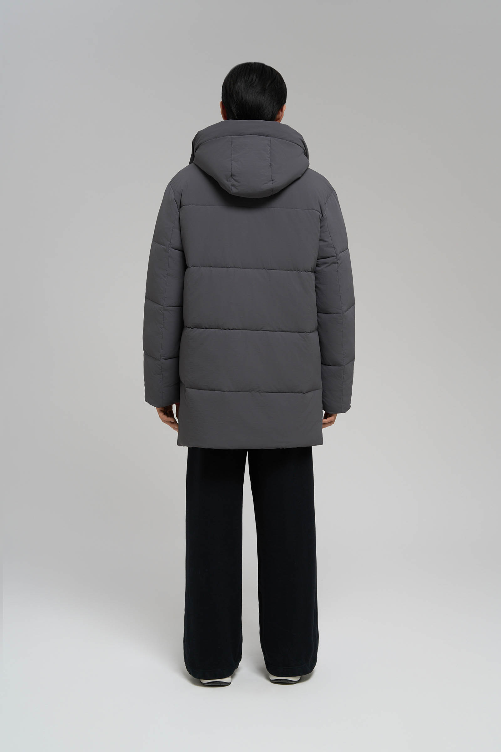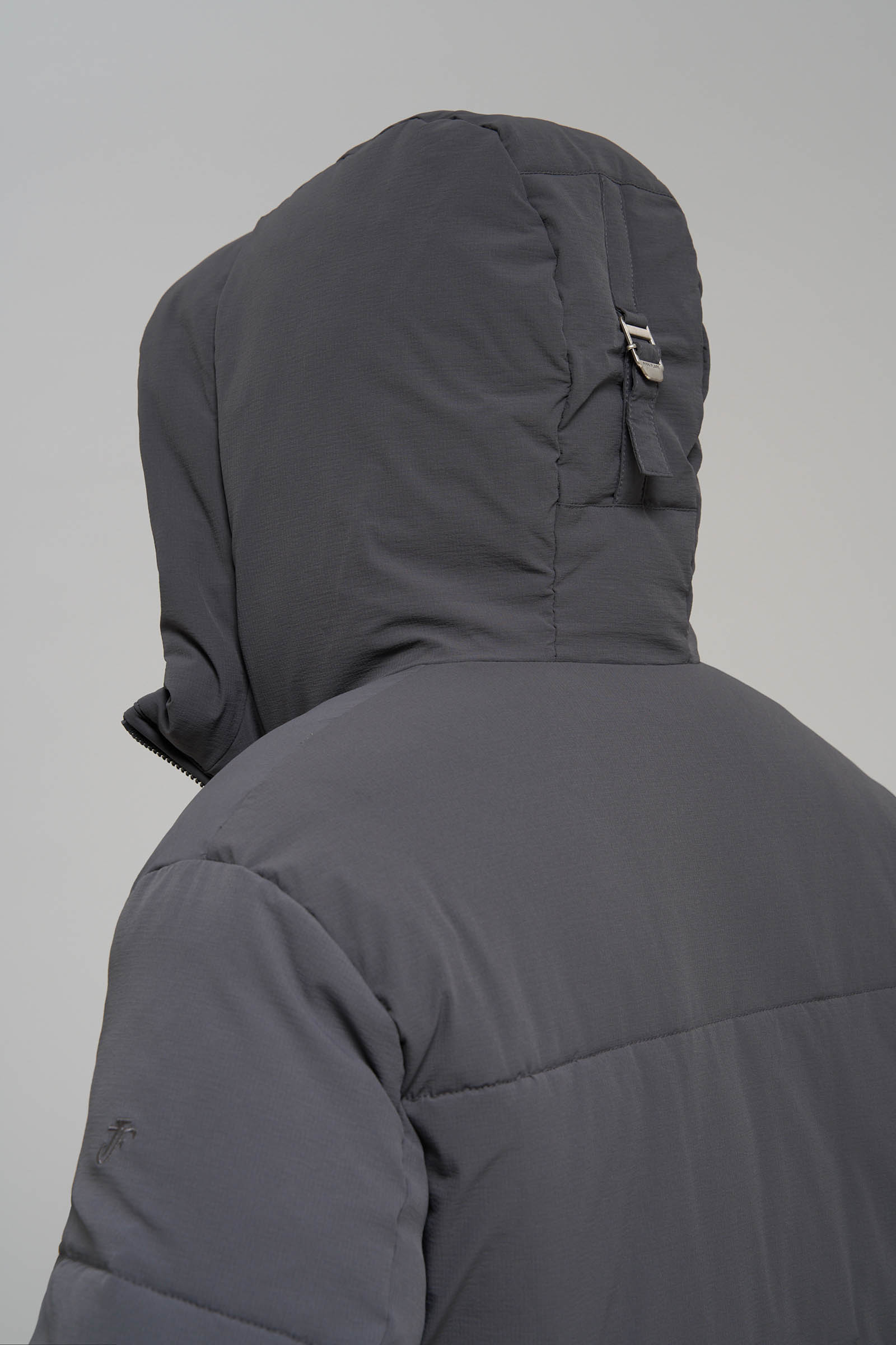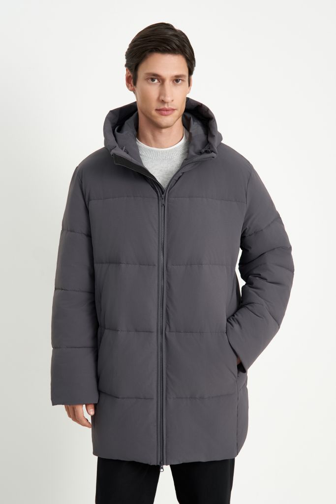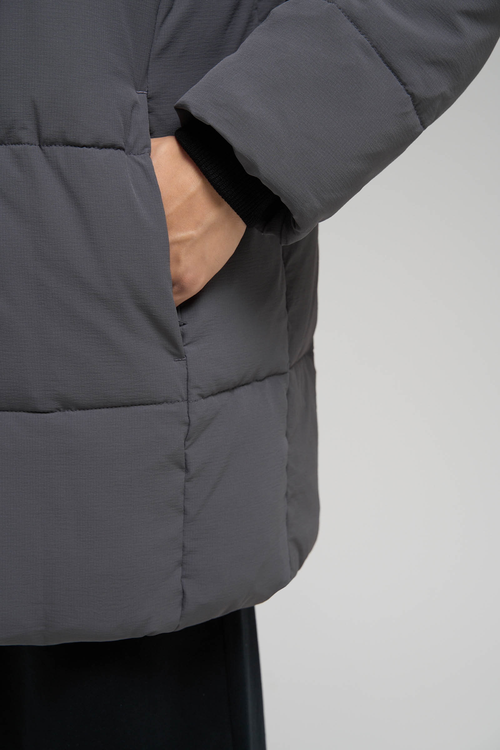 Пуховое полупальто с капюшоном и воротником-стойкой