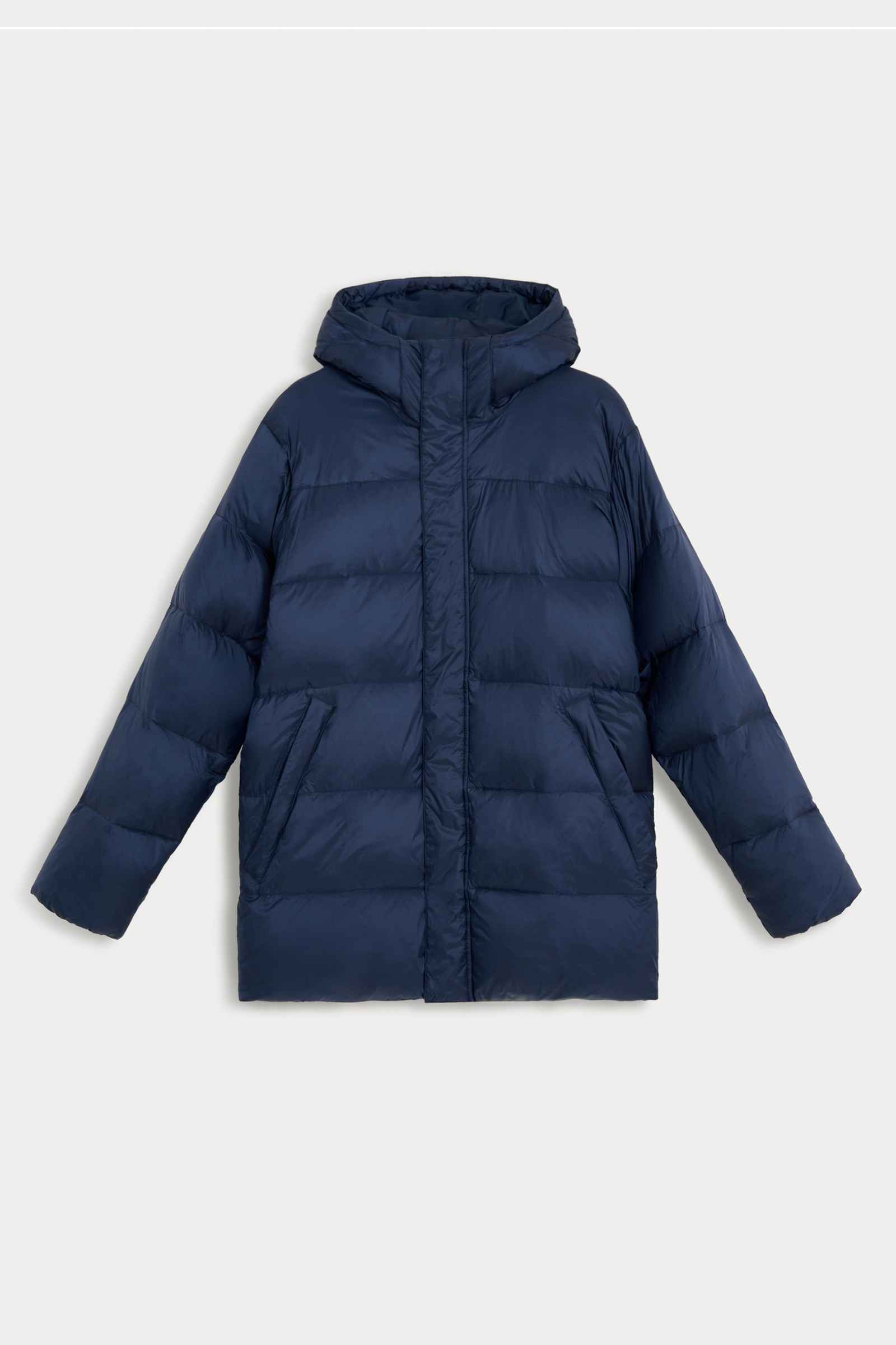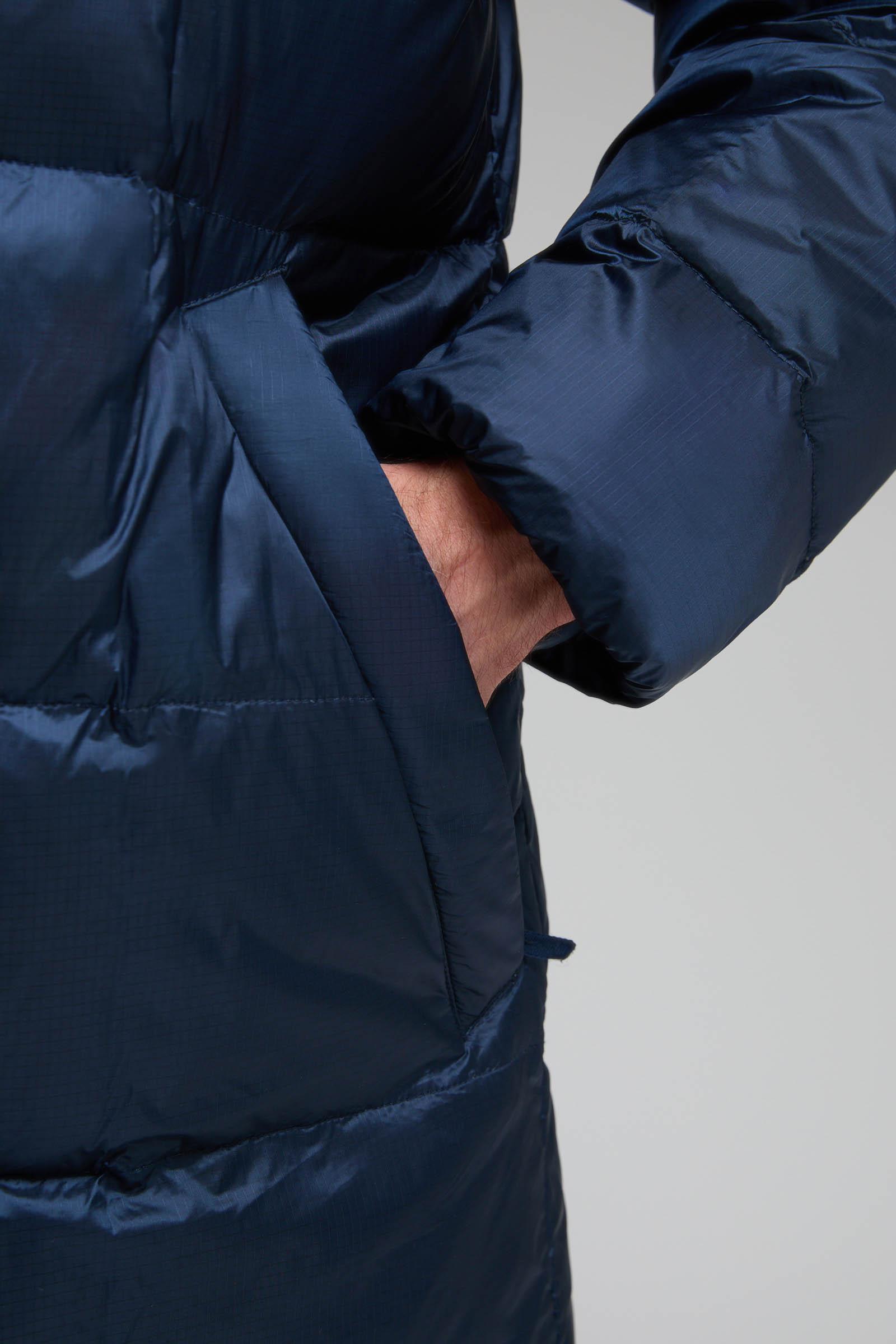 Пуховое полупальто с накладными карманами и капюшоном