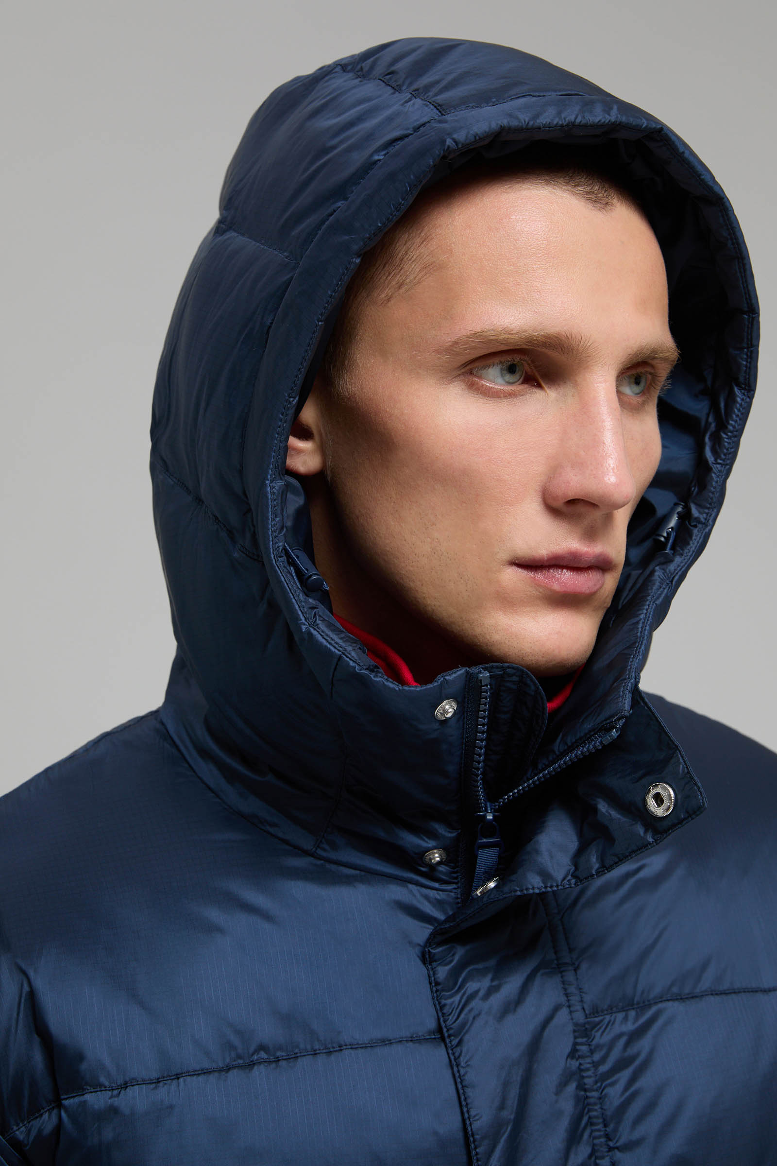 Пуховое полупальто с капюшоном и воротником-стойкой