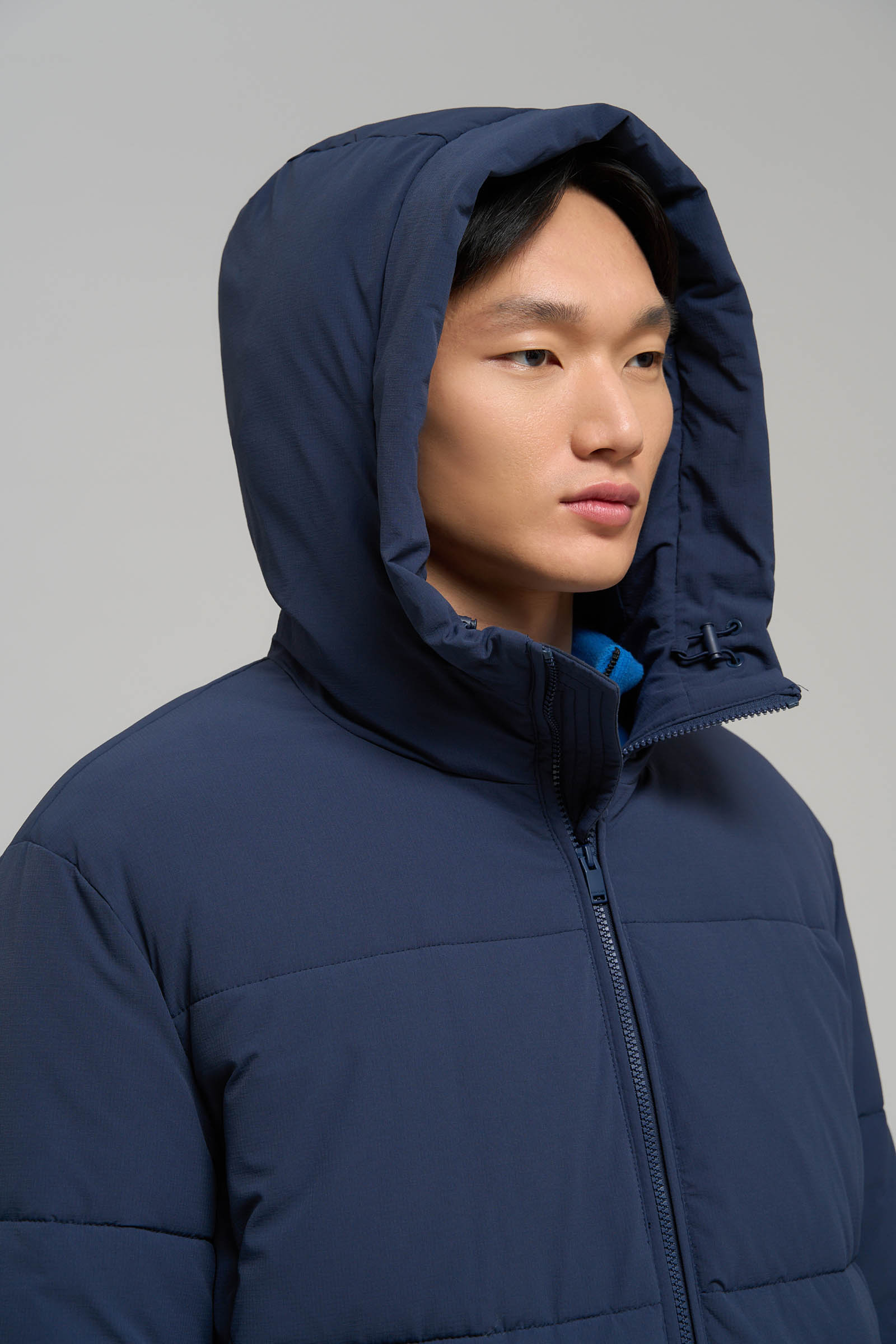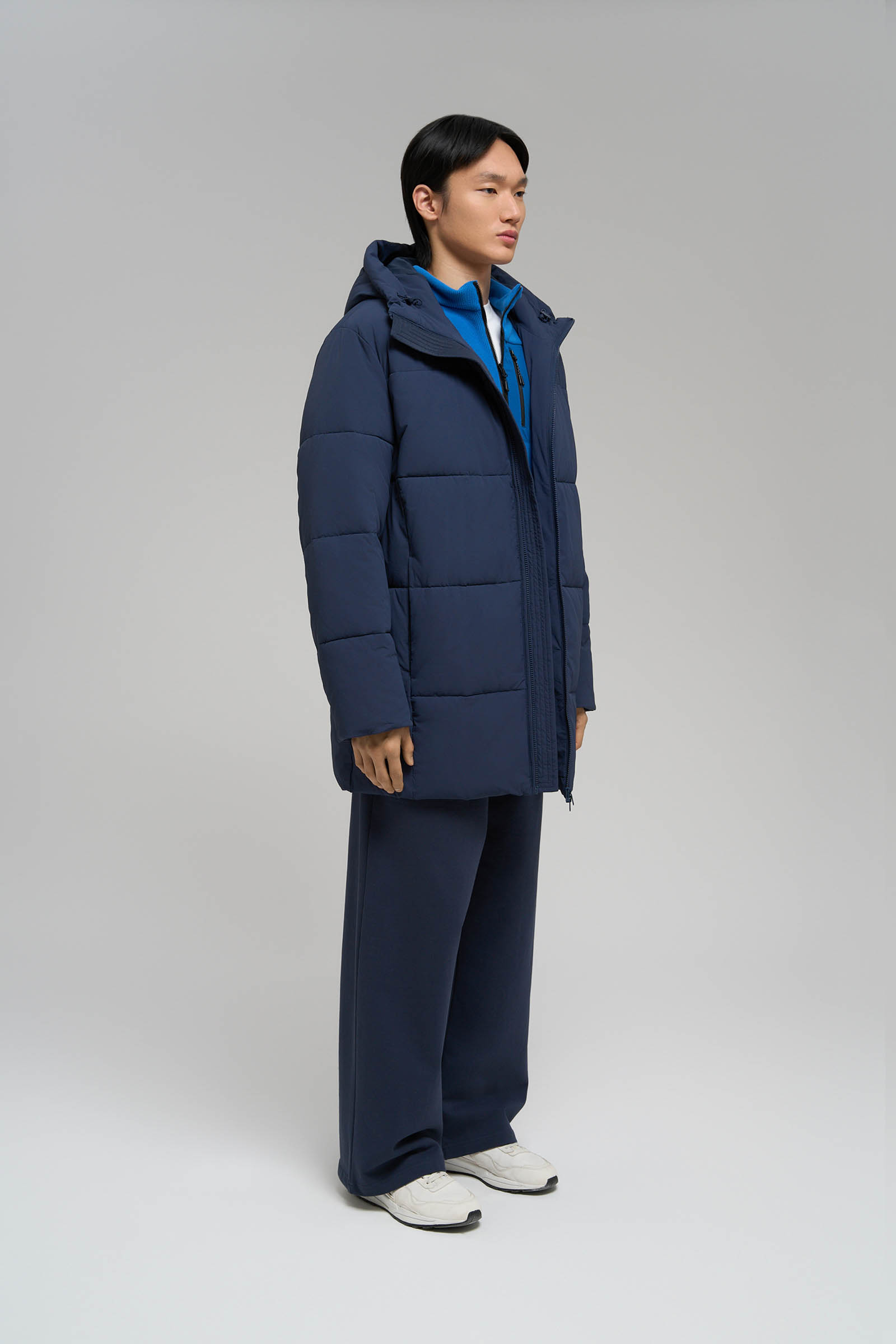 Пуховое полупальто с капюшоном и воротником-стойкой