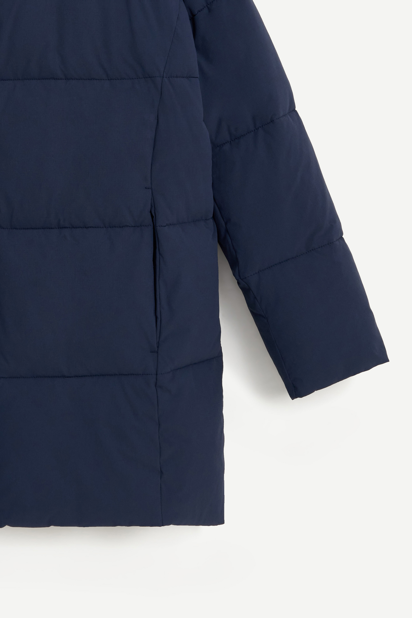Пуховое полупальто с накладными карманами и капюшоном