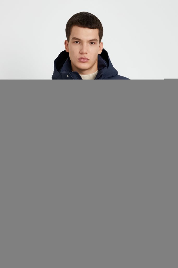 Пуховое полупальто с капюшоном и воротником-стойкой