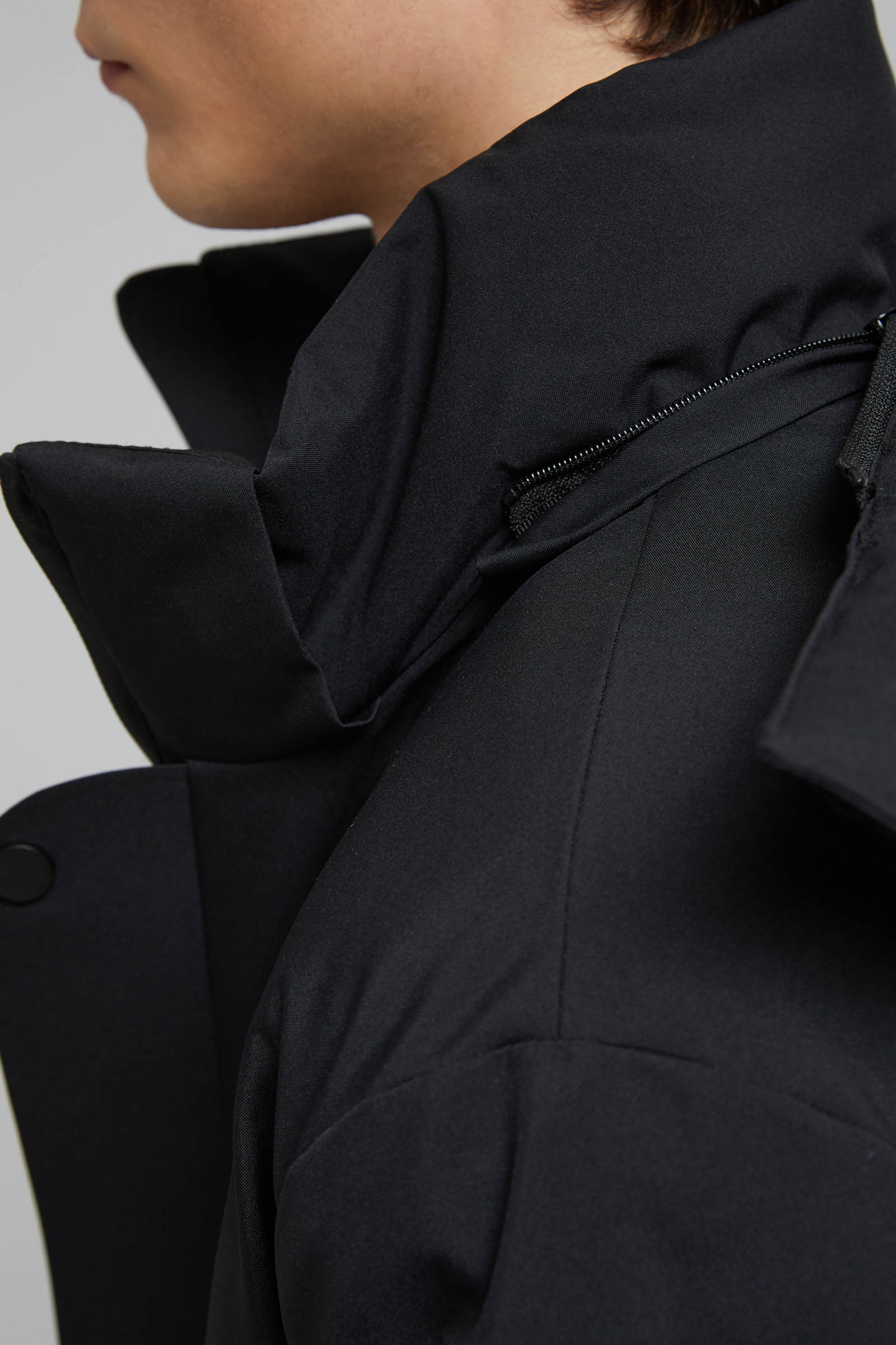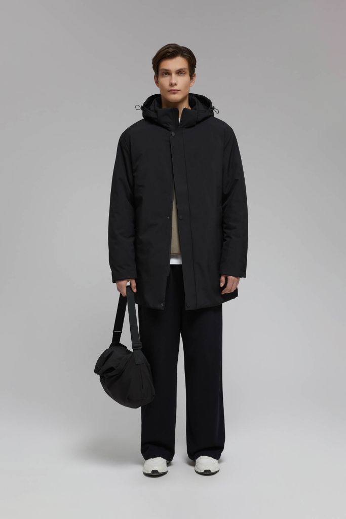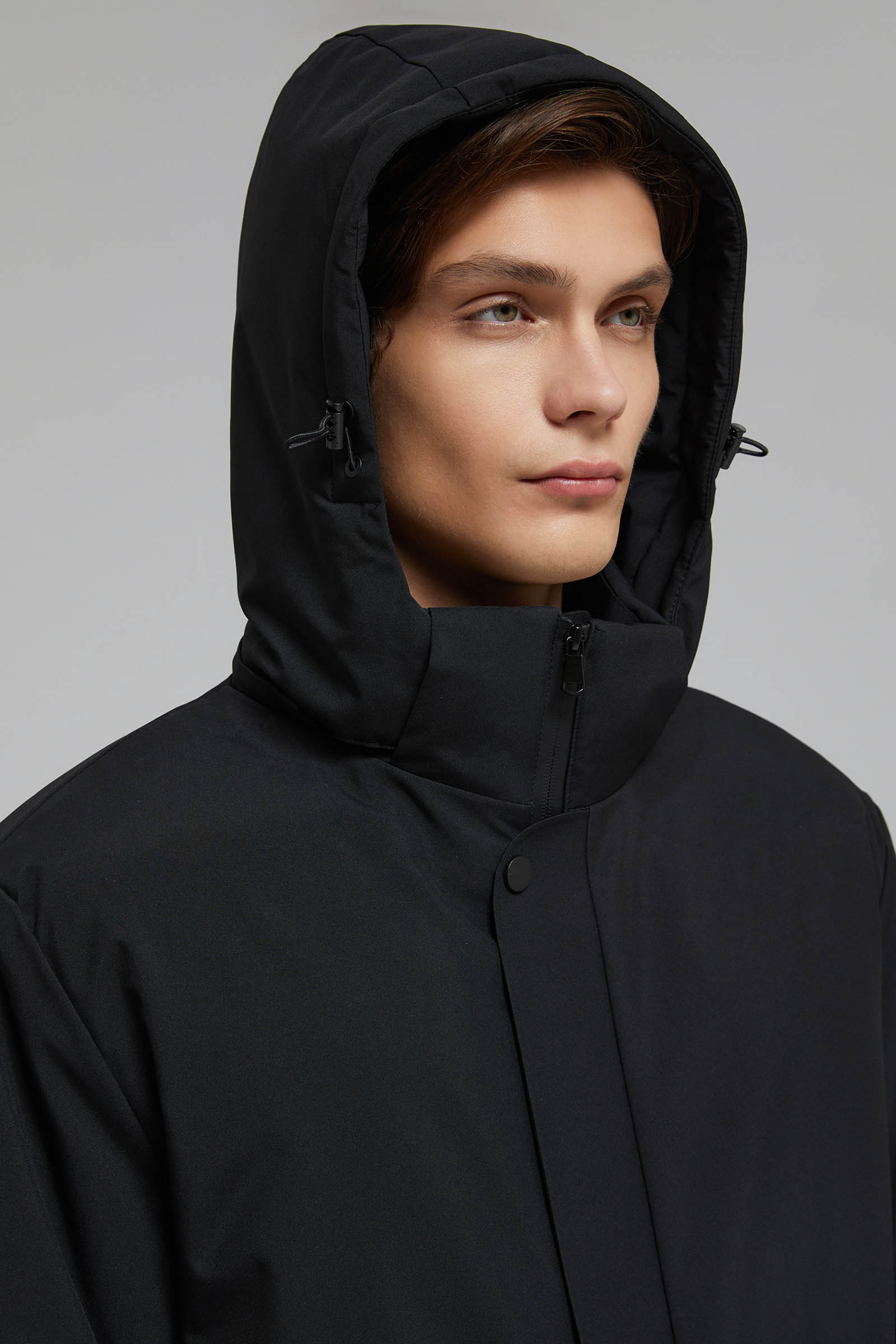 Пуховое полупальто с капюшоном и воротником-стойкой