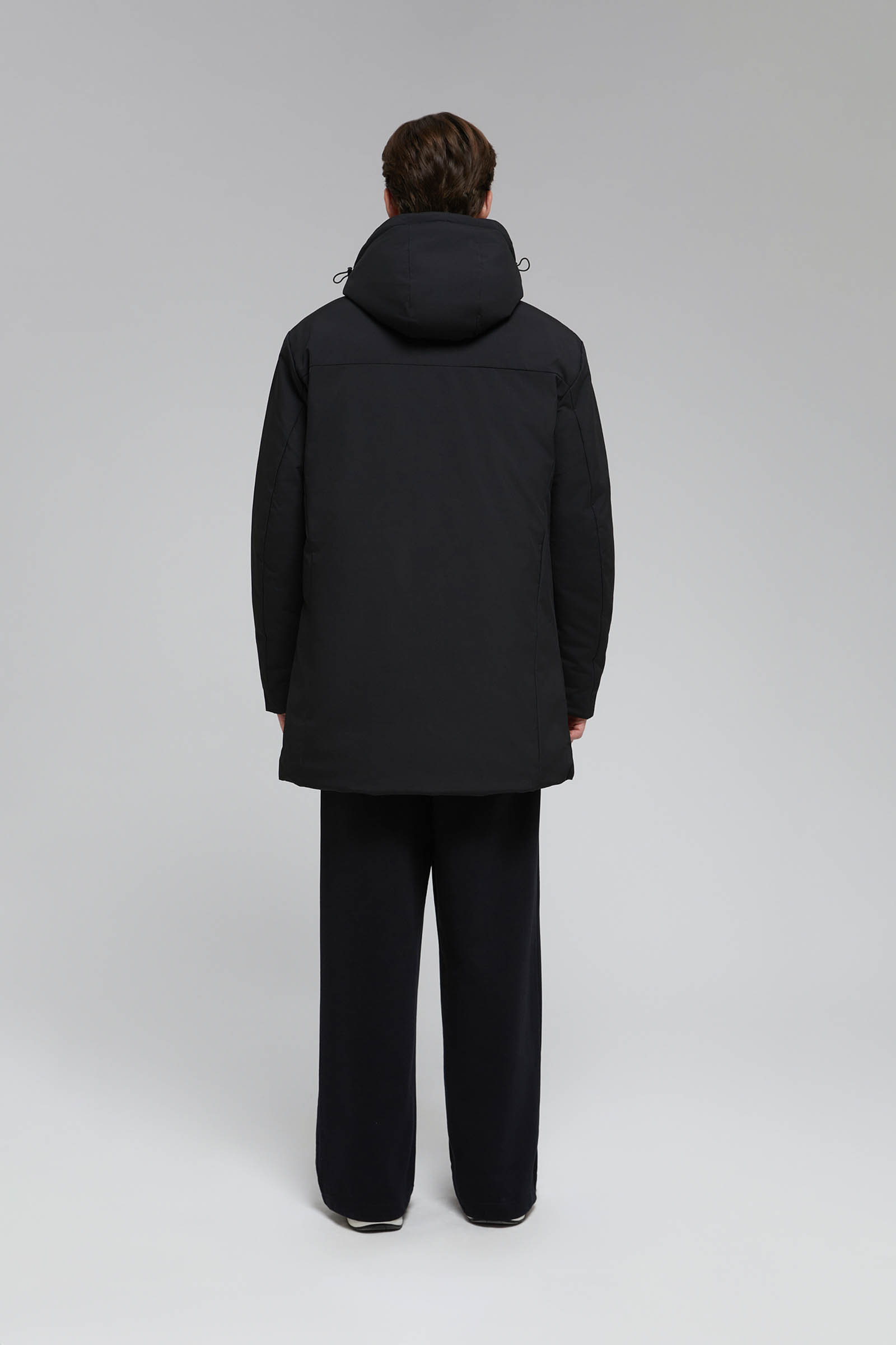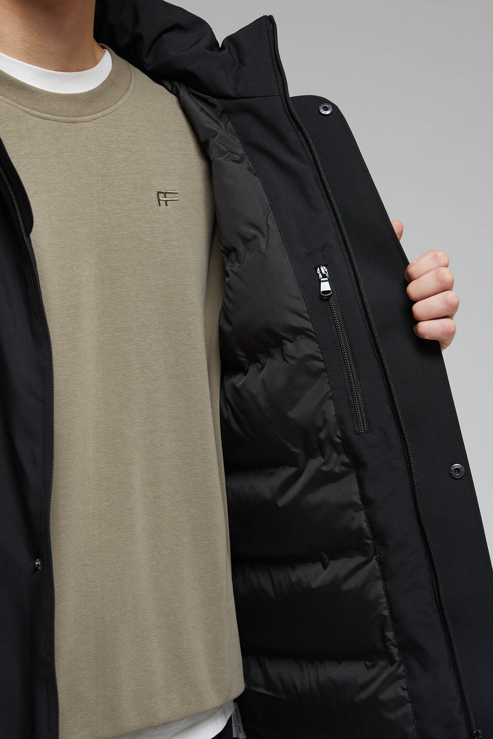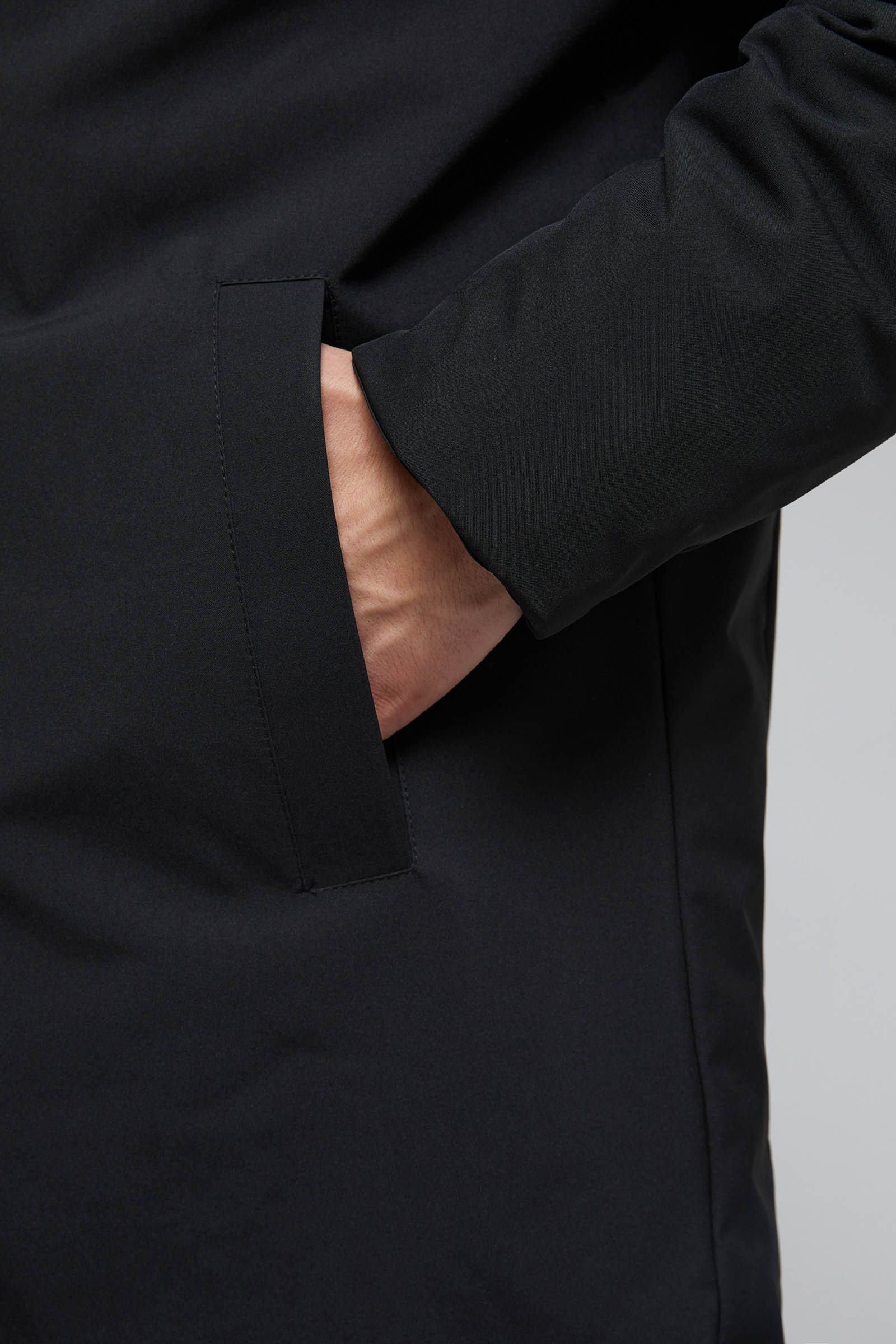 Пуховое полупальто с капюшоном и воротником-стойкой
